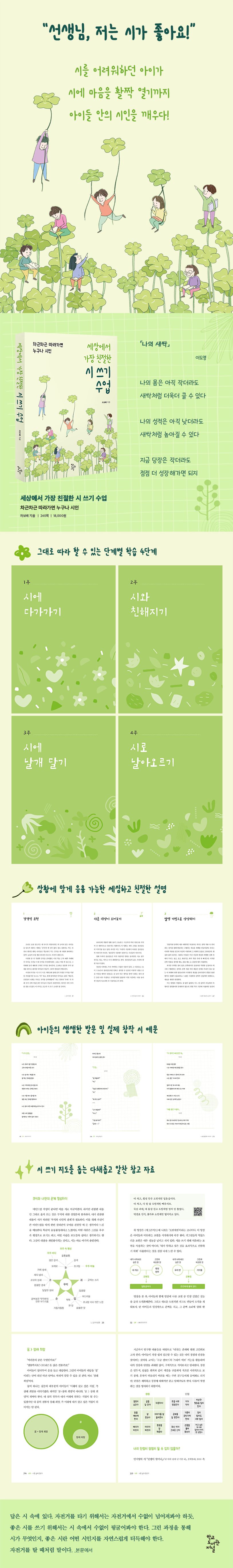현직 초등교사로서 오랜 시간 꾸준히 아이들과 시 쓰기 수업을 꾸려온 저자는 아이들을 ‘수동적인 수용자’로 머무르게 하는 시 교육의 문제점을 바로잡고자 한다. 단순히 ‘우리 시 한번 써보자!’ 하고 끝내는 게 아니라, 교육과정에 발맞춰 “시 쓰기를 체계적으로 지도할 수 있는 방법”을 고안해냈다. 무엇보다 이 책은 딱딱한 시 쓰기가 아니라 말랑말랑한 시 쓰기, 뻣뻣하게 굳어 있는 시 쓰기가 아니라 시 속에서 시와 함께 웃고 떠들고 뒹구는 시 쓰기 방법을 소개함으로써 교실 속 아이들이 시 쓰기의 이로움을 만끽하며 저마다의 고유한 시인으로 거듭날 수 있도록 한다.