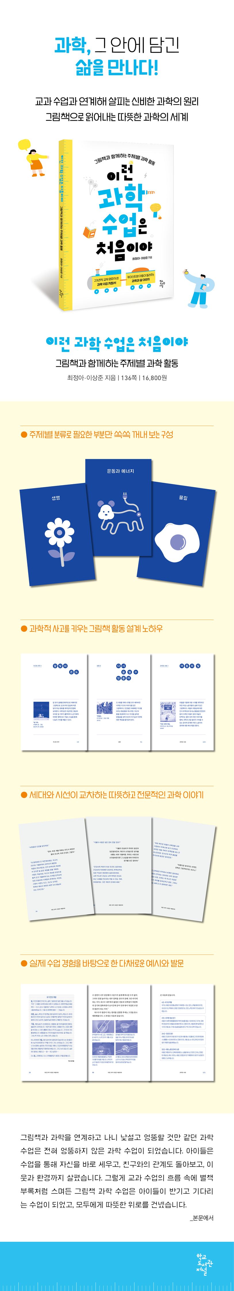 교육부에 따르면 오늘날 대한민국 초등학교 4학년과 중학교 2학년 학생들의 과학 성취도는 세계 최상위권인 반면, 과학 교과에 대한 흥미와 자신감은 최하위권을 밑돌고 있다. 잘하긴 하지만 억지로 공부하는 셈이다. 이에 10년이 넘도록 학교 현장에서 아이들과 그림책 수업을 해오던 저자는 단순 암기 위주의 주입식 과학 교육에서 탈피하는 동시에 과학을 향한 아이들의 흥미와 자신감을 높여줄 대안으로 ‘그림책 과학 수업’을 제시한다.
