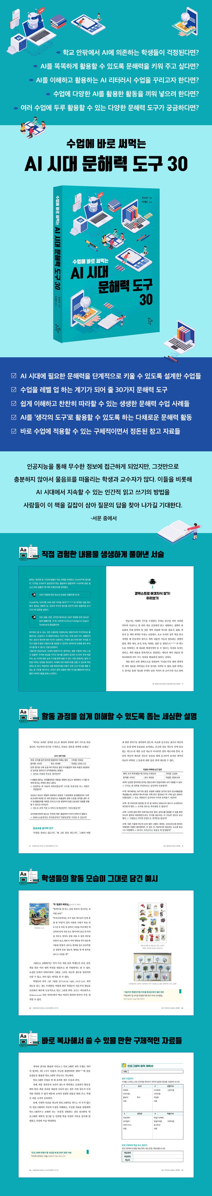 AI 사용이 익숙한 요즘 학생들이 AI에 휘둘리지 않고 AI를 생각의 도구로 활용할 수 있도록 하려면 어떻게 해야 할까? 저자는 여러 가지 텍스트, 이미지, 미디어 등을 읽고 이해하는 활동과 더불어 AI를 이해하고 다양하게 활용하는 AI 리터러시 수업을 제안한다. 배경지식을 넓히고, 질문하며 읽고, 여러 텍스트를 비판적으로 해석하고, 읽은 내용을 다면적으로 표현하는 문해력 활동을 하면 AI를 활용해 지식을 얻거나 재구성하는 힘을 키울 수 있다고 한다. 문해력을 확장하면서 AI와 협업하는 경험을 쌓아간다면 지식을 구성하는 주체가 될 수 있다고도 한다. 그리고 AI 활용 과정을 비판적으로 검토하는 시간을 갖는다면 AI와 공존하면서 주도권을 쥘 수 있다는 점을 덧붙인다. 이러한 AI 시대에 요구되는 문해력 수업을 구현할 수 있는 방법이 이 책에 담겨 있다. 저자는 수업에 바로 쓸 수 있는 30가지 문해력 도구를 활용한 수업 예시를 제시하며 수업을 안내한다. AI 네이티브 학생들의 문해력이 걱정되고 수업에서 AI 활용을 고민하는 교수자라면 이 책에서 든든한 답변을 얻을 수 있을 것이다.