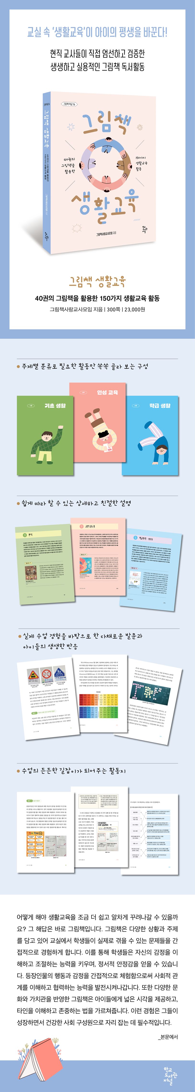 그림책 교육 열풍의 주역 그림책사랑교사모임이 ‘그림책’과 ‘생활교육’을 연계한 그림책 활동을 소개한다. 학교가 교과 지식뿐만 아니라 학생들이 성장하면서 필요한 다양한 삶의 역량을 키우는 장소인 만큼, 교사들은 바쁜 업무 속에서도 틈틈이 생활교육에 힘써야 한다. 이에 이 책은 현직 교사들이 직접 엄선하고 검증한 그림책과 주제별 활동을 담아냄으로써 교육 현장의 교사들에게 생활교육의 구체적이고 실용적인 길잡이가 되어주고자 한다.