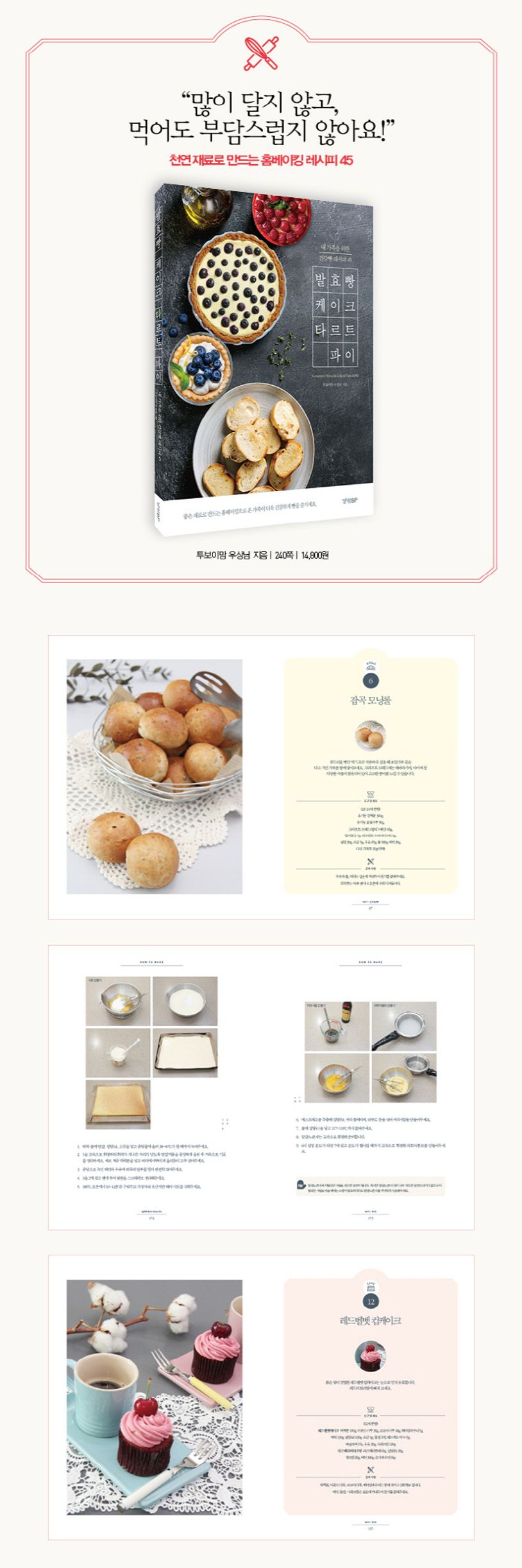 초보자도 쉽게 따라 할 수 있도록 만들기 간단하면서 응용하기 쉬운 레시피를 담은 『발효빵 케이크 타르트 파이』. 두 아들의 엄마인 저자가 가족들을 위해 유화제나 인공첨가물이 없는, 건강한 재료로 만드는 레시피 45가지를 소개한다. 가족과 함께 주변에서 쉽게 볼 수 있는 식빵·베이글·치아바타·포카치아 등 매일 먹어도 맛있는 발효빵을 비롯하여 치즈케이크·카스텔라·브라우니·쉬폰케이크·파운드케이크·티라미수 등 달콤한 케이크류, 에그 타르트·애플 타르트·키슈·팔미에·립파이 등 작교 귀여운 타르트와 파이들을 재료에 대한 불안감에서 벗어나 집에서 직접 만들며 건강하게 빵을 즐길 수 있도록 했다.