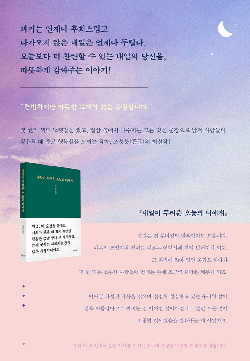 〈내일이 두려운 오늘의 너에게〉를 읽으며 나 자신을 너무 높은 기준점에 두고 왜 더 잘하지 못하느냐고 자책하진 않았는지 되돌아봅니다. 작가는 추월이 아닌 동행을 배우고 타인과의 경쟁이 아닌 나와의 경쟁을 하는 것이 중요함을 이야기합니다. 이 세상을 살아남기 위해선 경쟁을 멀리할 수 없겠지만, 꼭 누군가를 앞설 필요는 없다고 말이죠. 내일이 두려운 우리에게 필요한 것은 어쩌면 괜찮다는 위로보다 자신을 알아가는 시간일지도 모릅니다. 내가 원하는 것은 무엇인지, 지금 내게 필요한 것은 무엇인지 차근차근 마음속 이야기에 귀 기울이며 온전한 내가 되어보는 시간. 이 책은 당신에게 그런 시간을 선물해줄 것입니다.