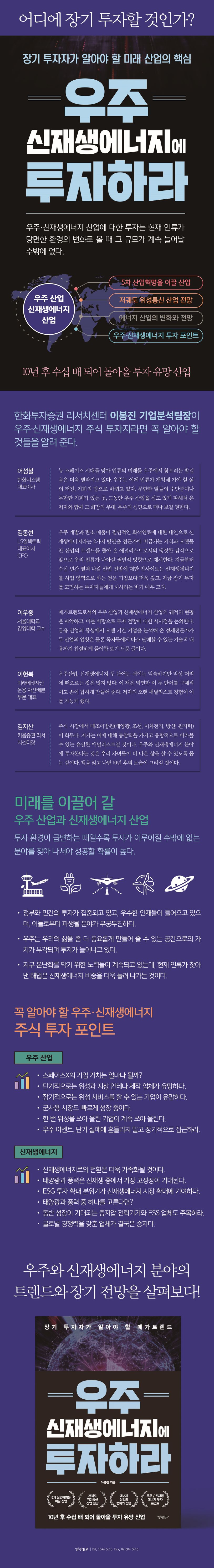 해당 분야 베스트 애널리스트인 저자는 이 책에서 왜 장기 투자를 해야 하는지, 장기 투자를 하기 위해 알아야 할 메가트렌드로는 어떤 것들이 있는지, 메가트렌드 중에서도 우주와 신재생에너지를 봐야 하는 이유가 무엇인지, 우주 산업에서 특히 주목해야 할 분야인 저궤도 위성에 대해서, 그리고 신재생에너지가 왜 중요한지, 현재 나타나고 있는 신재생에너지 분야의 트렌드와 장기 전망 등에 대해 설명한다. 또한 투자자의 관점에서 어떤 부분을 중요하게 봐야 하는지, 투자 대상을 고를 때 기준으로 삼아야 하는 투자 포인트를 짚어 준다. 우주와 신재생에너지 산업을 잘 모르지만 관심을 갖고 있는, 혹은 관심을 가져 볼까 하는 사람들에게 도움이 될 것이다.