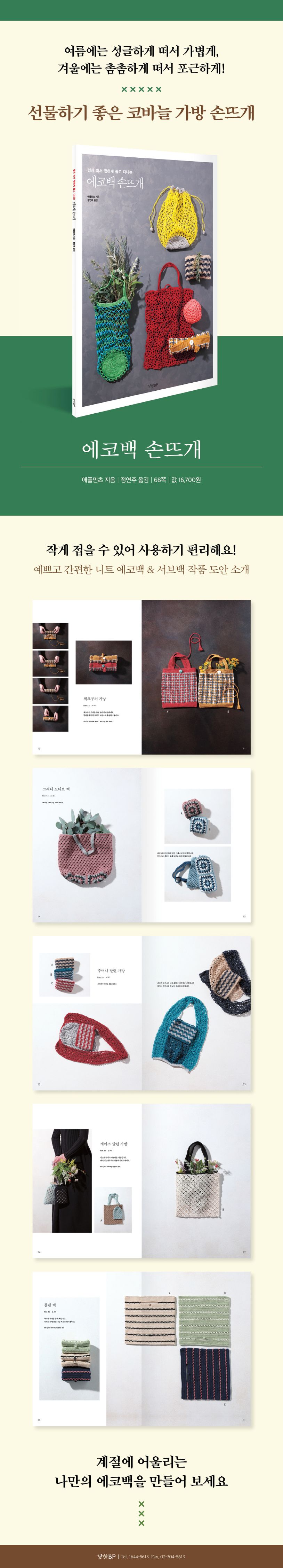 아기자기하고 예뻐서 어디에든, 누구를 만나든 사계절 내내 들고 다닐 수 있는 에코백과 서브백을 소개했습니다. 멋진 옷차림을 완성하는 포인트 소품으로도 손색이 없는 디자인들입니다. 유명 뜨개 디자이너들이 만든 작품이라 디자인이 독창적이고 세련되어 선물하기에도 좋습니다. 봄에는 화사한 색으로, 가을에는 차분한 색으로, 여름에는 까슬거리는 가벼운 실로, 겨울에는 보들보들 포근한 실로 떠 보세요. 계절과 잘 어울리는 개성 있는 나만의 에코백을 완성할 수 있습니다. 책에서 소개하는 네트 백, 체크무늬 가방, 모눈뜨기 가방, 모티브 백, 스퀘어 백, 파인애플 무늬 가방, 주머니 달린 가방, 바이컬러 백, 케이스 달린 가방, 복주머니 가방, 플랫 백 등을 취향에 따라 실 종류와 색상을 바꿔 떠도 좋습니다. 작게 접을 수 있어서 간편하면서도 예쁜 에코백을 직접 떠서 매일매일의 기분에 따라 활용해 보세요.