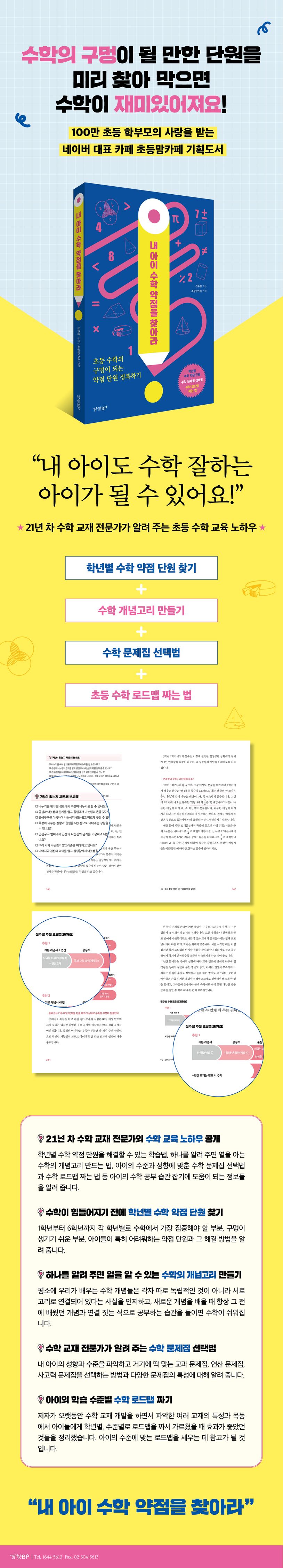 이 책에는 21년 차 수학 교재 전문가가 교재 개발과 교육 현장에서 아이들을 직접 가르치며 터득한 수학 교육 노하우를 담았습니다. 학년별 수학 약점 단원을 해결할 수 있는 학습법, 하나를 알려 주면 열을 아는 수학의 개념고리 만드는 법, 아이의 수준과 성향에 맞춘 수학 문제집 선택법과 수학 로드맵 짜는 법 등 아이의 수학 공부 습관 잡기에 도움이 되는 정보들을 알려 줍니다. 넘쳐나는 수학 학습에 관한 정보 속에서 어떤 것을 취해야 할지 잘 모르는 학부모들과 수학으로 고통받고 있는 아이들에게 도움이 될 것입니다.