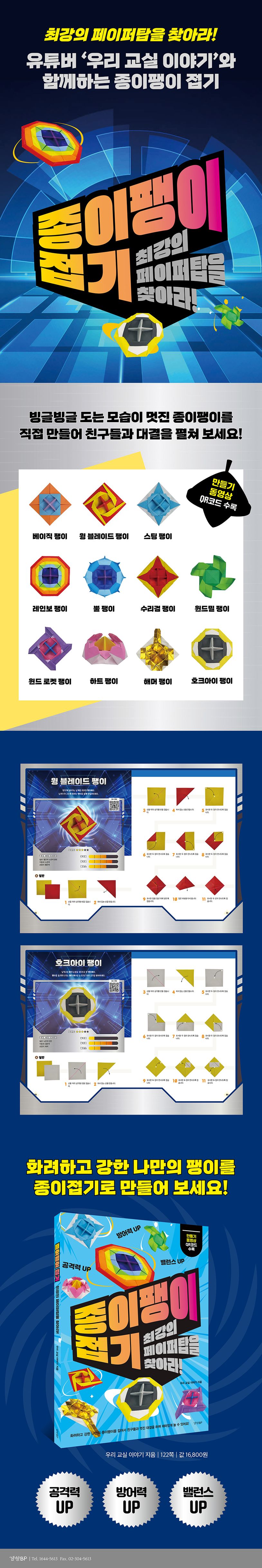 종이접기는 두 손을 움직여 다양한 모양의 평면 혹은 입체적인 조형물을 만들어 내는 창의적인 활동입니다. 종이를 접는 과정을 통해 문제를 스스로 해결하는 능력을 키우고, 상상력을 기를 수 있습니다. 종이접기를 하는 동안 집중력과 상상력도 향상됩니다. 이 책에는 유튜버 ‘우리 교실 이야기’에서 동물, 만화, 게임 캐릭터를 활용해 창작한 종이팽이 접는 방법을 소개했습니다. 단순하고 틀에 박힌 종이접기가 아닌, 작은 변화로 멋진 종이팽이를 접을 수 있습니다. 색종이 여러 장으로 각각의 부품을 접어 조립해 만드는 종이팽이는 그 과정 자체만으로도 성취감을 느낄 수 있어 즐겁습니다. 내가 만든 종이팽이로 친구들과 대결 놀이를 하면 더욱 재미있습니다.