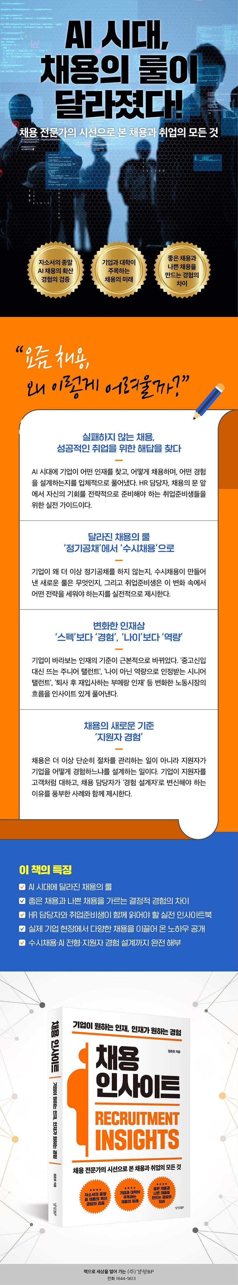 채용의 흐름이 달라지고 있다. 수시 채용과 아웃바운드 리크루팅이 일상이 된 지금, 기업과 인재는 완전히 새로운 방식으로 만난다. 기업은 ‘지원자 경험’을 설계하고, 지원자는 ’커리어 여정‘을 설계한다. 수시 채용, AI 전형, 지원자 경험 설계까지 달라진 채용의 룰을 이해해야 기업은 인재를 얻고 지원자는 합격의 문을 열 수 있다. 이 책은 AI 시대에 기업이 어떤 인재를 찾고, 어떻게 채용하며, 어떤 경험을 설계하는지를 입체적으로 풀어냈다. 채용의 최전선에서 변화의 물결을 먼저 파악해야 하는 HR 담당자, 채용의 문 앞에서 자신의 기회를 전략적으로 준비해야 하는 취업준비생들을 위한 실전 가이드이다.