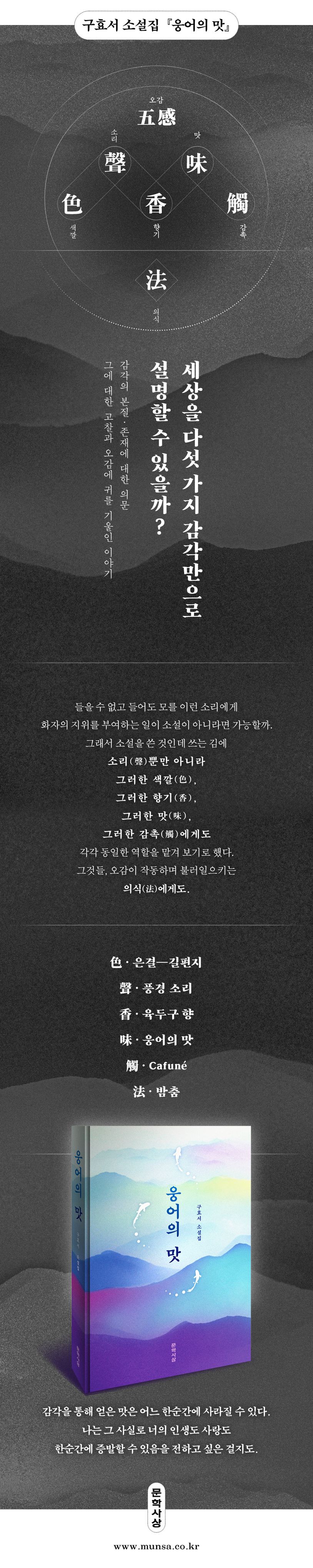 묵직하고 깊은 필체, 서정성과 탄탄한 주제 의식을 겸비한 구효서의 소설집 『웅어의 맛』이 출간되었다. 등단 이후 큰 공백 없이 꾸준히, 다양한 실험으로 작품의 세계를 넓혀 온 구효서는 이상문학상, 대산문학상, 동인문학상 등을 수상하며 우리 시대 대표 소설가로 자리 잡았다. 사유하는 힘을 지닌 소설을 써온 구효서가 이번엔 반야심경의 ‘색色ㆍ성聲ㆍ향香ㆍ미味ㆍ촉觸’을 소재로 한 오감소설을 내놓았다. 독특한 주제와 서술 기법을 선보인 이번 소설집은 보고 듣고 느끼는 감각이라는 것이 무엇인지, 감각에 무조건적으로 의존하고 있지는 않은지 의심하고 경계하게 만든다.