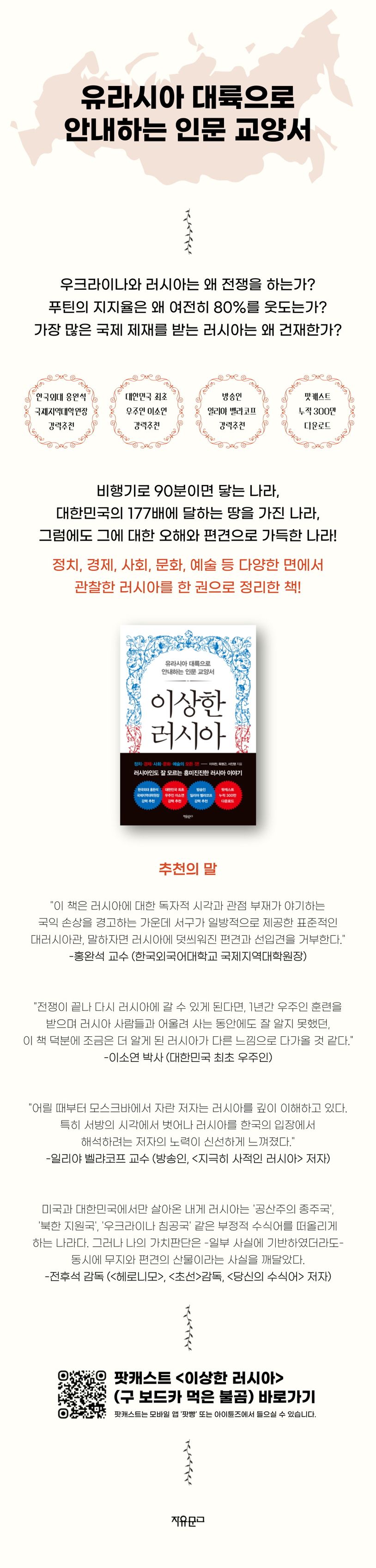 이런 이유에서 러시아의 정치, 경제, 사회, 문화, 예술 등을 두루 훑어보는 이 책의 출간은 시기적으로도 큰 의미가 있다. 러시아를 제대로 알아보며 편견과 오해는 풀고, 바짝 긴장되고 경색된 정세 속에서 나름의 해결점을 찾아보자는 취지의 책이기 때문이다.