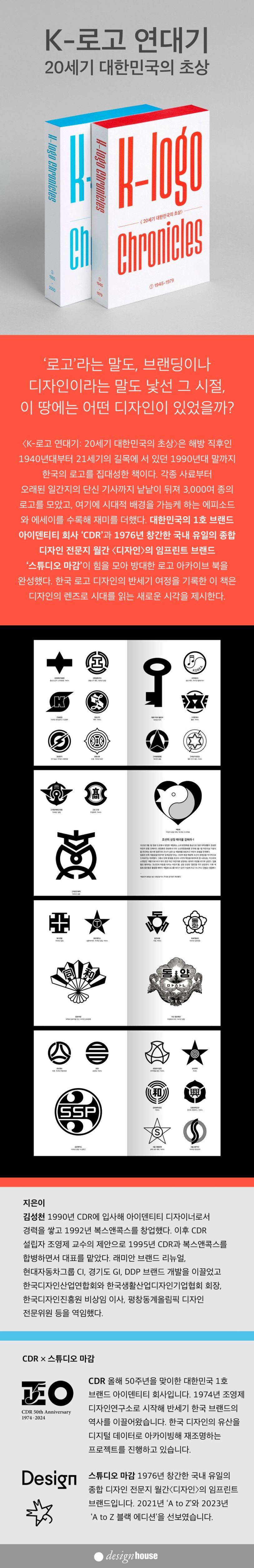 〈K-로고 연대기: 20세기 대한민국의 초상〉은 해방 직후인 1940년대부터 21세기의 길목에 서 있던 1990년대 말까지 한국의 로고를 집대성한 책이다. 각종 사료부터 오래된 일간지의 단신 기사까지 낱낱이 뒤져 3,000여 종의 로고를 모았고, 여기에 시대적 배경을 가늠케 하는 에피소드와 에세이를 수록해 재미를 더했다. 대한민국의 1호 브랜드 아이덴티티 회사 ‘CDR’과 1976년 창간한 국내 유일의 종합 디자인 전문지 월간 〈디자인〉의 임프린트 브랜드 ‘스튜디오 마감’이 힘을 모아 방대한 로고 아카이브 북을 완성했다.