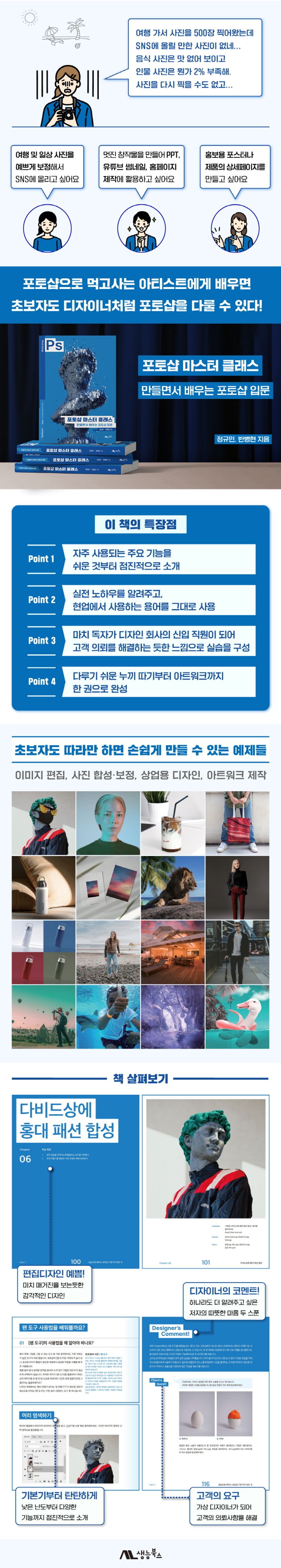 포토샵 작업에서 활용 빈도가 높은 기능들을 활용하여 다양한 아트워크를 만들면서 배울 수 있다. 포토샵이 보유하고 있는 기능들을 모두 클리어해간다는 느낌이 아닌, 실전에 필요한 기능과 기본기만으로 어떤 상황에서도 대응할 수 있도록 구성하였다. 특히 난도가 너무 높지 않아 접근하기 쉬우면서도 가볍지 않은 밀도의 예제들로 수록하였다.