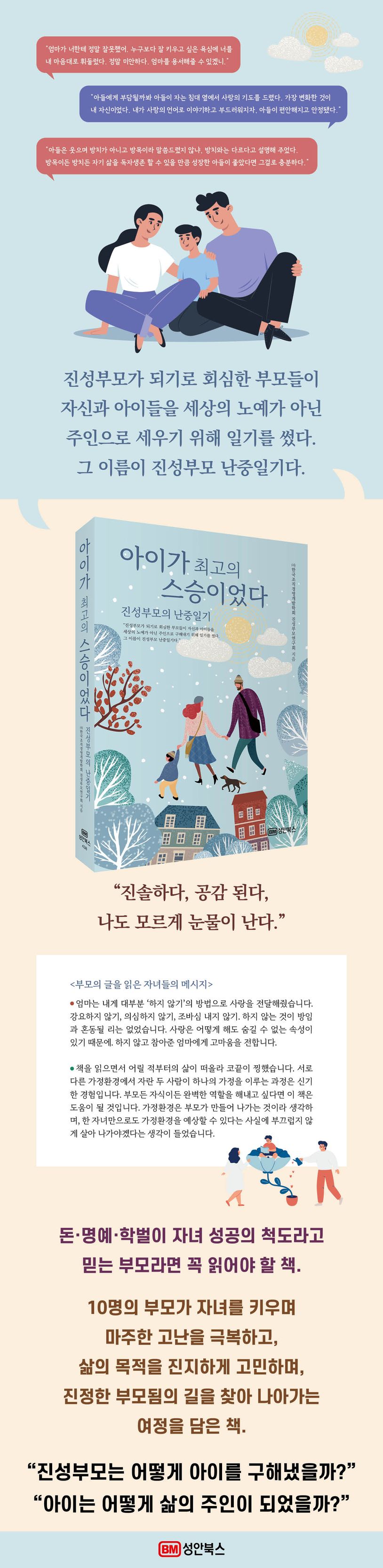 이 책은 부모가 된 누구에게나 찾아올 수 있는 부모와 자식 간의 갈등을 치열한 경험과 고민을 통해 슬기롭게 극복한 10명의 진성부모 선배들의 경험과 노하우를 여과 없이 진솔하고 담백하게 옴니버스 에세이 형식으로 엮어 냈다.