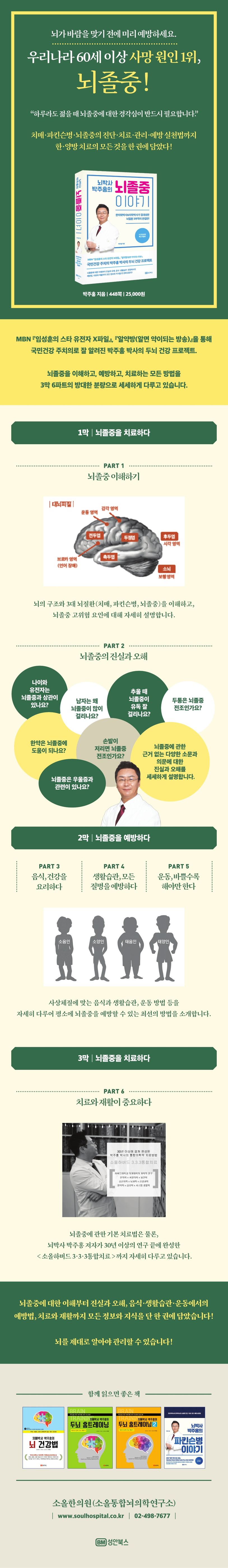 국민건강주치의로 불리는 박주홍 박사의 그간의 연구와 노하우를 꼼꼼하게 수록했다. 뇌졸중에 대한 이해부터 진실과 오해, 음식·생활습관·운동에서의 예방법, 치료와 재활까지 모든 정보와 지식을 한 권에 담아, 노인이 되면 반드시 뇌졸중(중풍)에 걸릴 것이라는 막연한 두려움보다는 뇌졸중이 어떻게 오고, 전조 증상은 어떠하며, 미리 예방하기 위해서 각자가 해야 할 일은 무엇인가를 아는 것이 중요하다고 일깨워주는 도서이다.