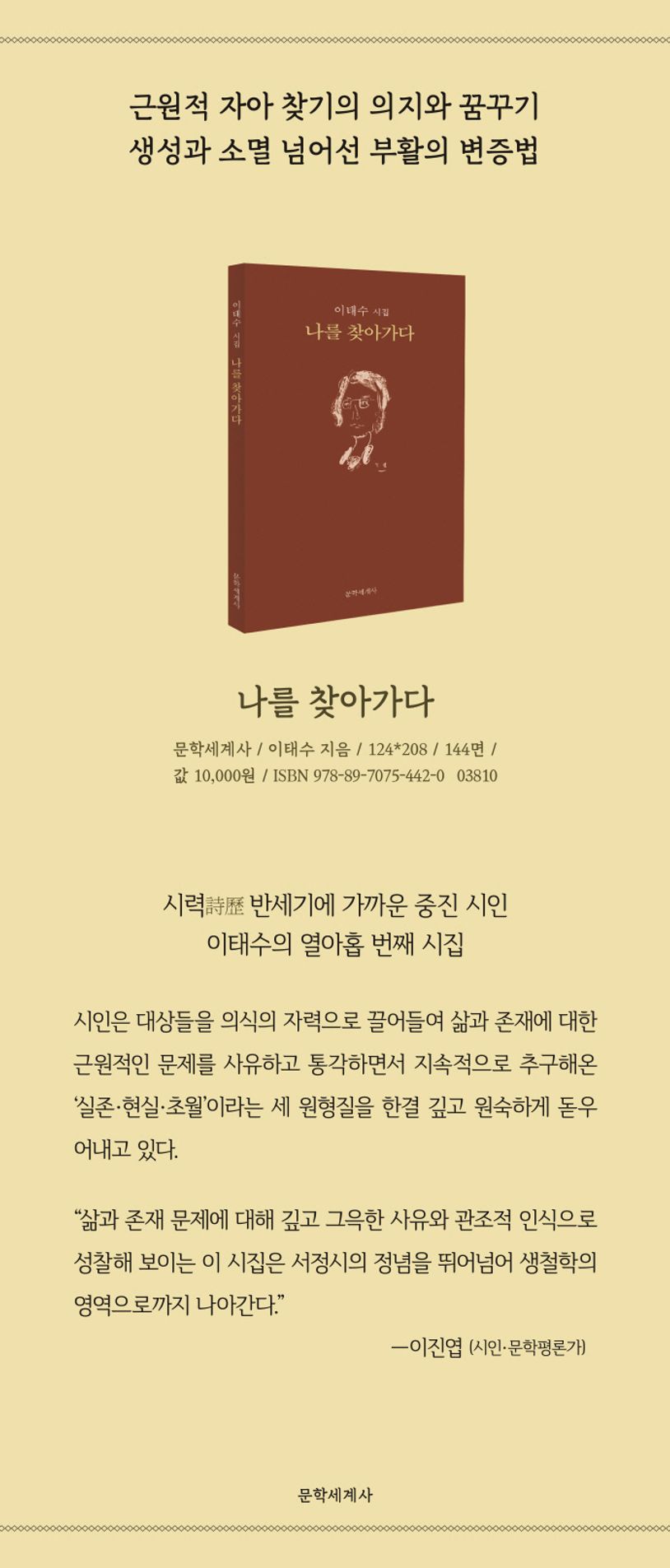 2018년부터 해마다 시집을 낼 정도로 왕성한 활동을 펼쳐온 이태수 시인이 올해 연초에 출간한 『담박하게 정갈하게』에 이어 신작시 75편을 담은 열아홉 번째 시집 『나를 찾아가다』를 발간했다. ‘실존?현실?초월’을 기본명제로 철학적 사유를 부드러운 서정적 언어로 감싸 보이는 그의 이번 시집은 삶과 존재 문제에 대해 한결 깊고 그윽하게 성찰하면서 생철학의 영역으로까지 나아간다. 삶의 다양한 울림에 귀 기울이며 근원적인 자아를 찾아 나서는 꿈에 부단히 불을 지피는 그는 이 여정에서 자연을 매개로 삶의 활력을 되찾기도 하며, 삶과 죽음이라는 양극을 끌어안고 부활의 눈부신 지평에서 변증법적으로 융합하려는 시도를 펼쳐 보인다.