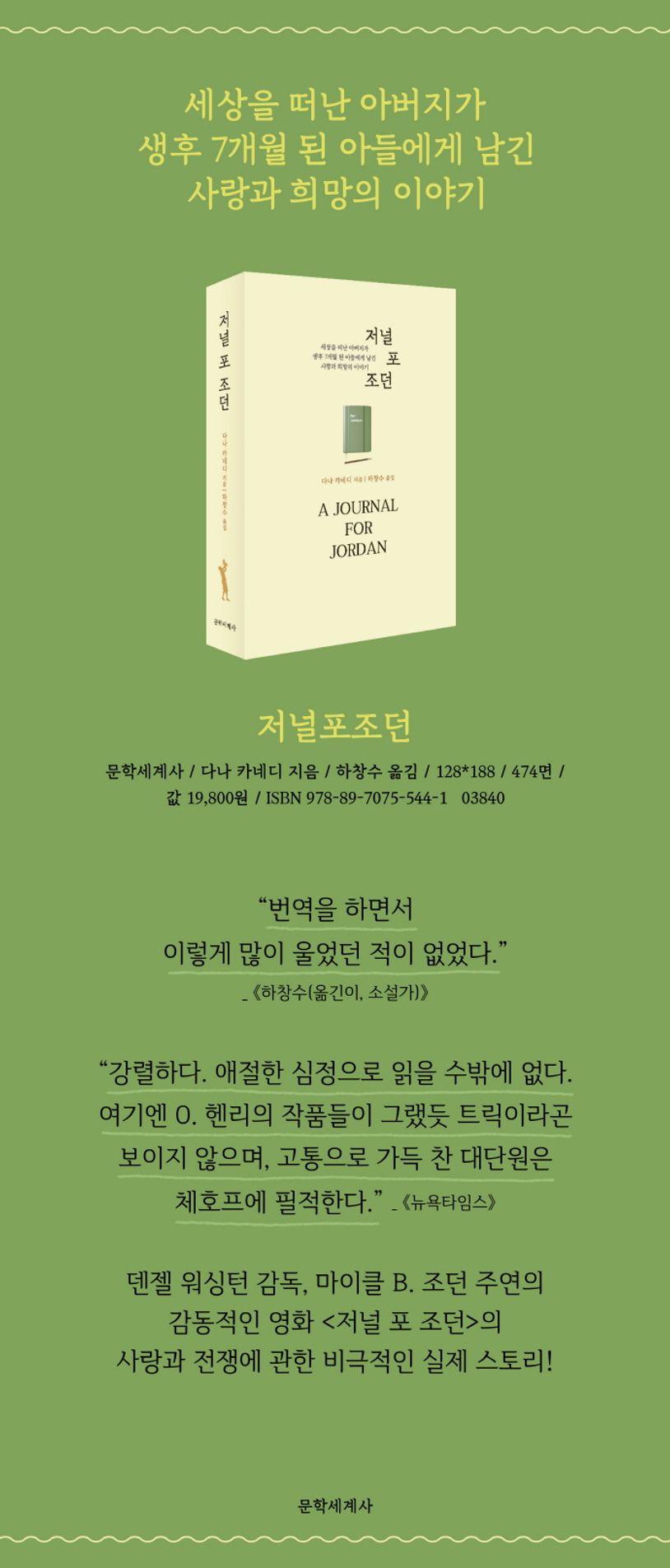 『저널 포 조던』을 옮길 때 저도 모르게 눈물이 흘러내려 자판을 두드리다 말고 한참이나 멍하니 있을 때가 많았습니다. 어떤 때는 흐느껴 우는 소리를 들은 아내가 조심스럽게 서재 문을 두드린 적도 있었습니다. 찰스 먼로 킹 상사가 세상을 떠났다는 사실을 이미 알고 있음에도 불구하고, 어쩌면 그래서 더 가슴이 아파 눈물을 참기 힘들었을지도 모릅니다.