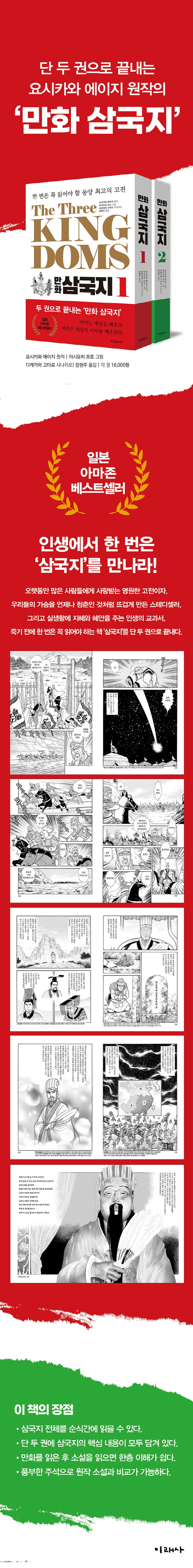 이런 상황에서 출간된 『만화 삼국지』(전2권)가 반가운 이유는 단 두 권만 읽고도 『삼국지』의 핵심 내용을 남녀노소 누구나 쉽게 파악할 수 있기 때문이다. 이 책은 특히 『삼국지』에 등장하는 수많은 영웅호걸들 가운데 가장 ‘호감형’인 유비를 주인공으로 이야기를 전개하고 있어 『삼국지』를 새로운 관점으로 읽게 해준다. 아울러 유비를 중심으로 관우와 장비, 조조와 동탁 같은 인물도 다양하게 만나볼 수 있다.