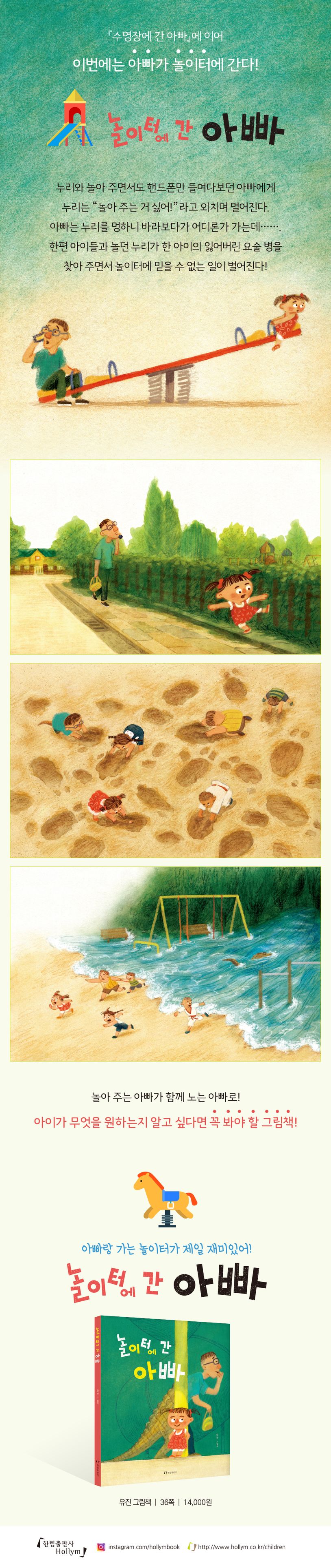 이번에는 아빠가 놀이터에 간다! 누리와 놀아 주면서도 핸드폰만 들여다보던 아빠에게 누리는 “놀아 주는 거 싫어!”라고 외치며 멀어진다. 아빠는 누리를 멍하니 바라보다가 어디론가 가 버리는데……. 한편 아이들과 놀던 누리가 어떤 아이의 잃어버린 요술 병을 찾아 주면서 놀이터에 믿을 수 없는 일이 벌어진다! 놀아 주는 아빠가 함께 노는 아빠로 거듭나는 이야기를 통해 아이와 부모 독자 모두에게 공감을 일으키는 그림책이다.