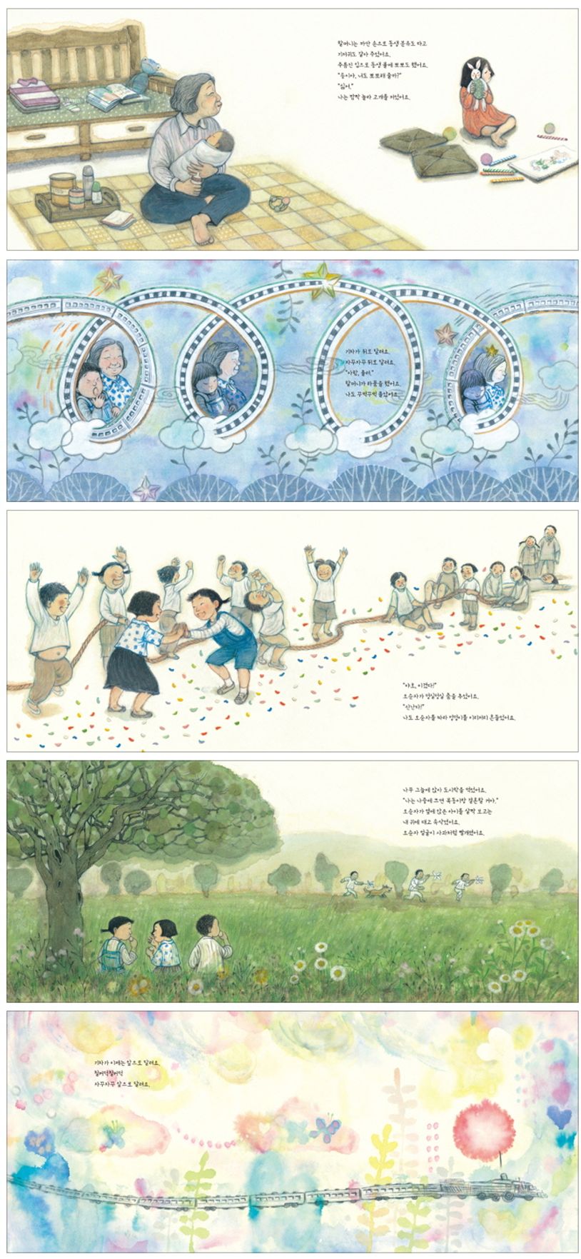 할머니와 손녀의 사랑과 따뜻한 추억 여행을 담은 그림책『뒤로 가는 기차』.동생을 돌봐 주러 시골에서 올라오신 할머니가 귀찮고 창피한 송이. 그러던 어느 날, 송이는 할머니와 함께 시골 가는 기차에 오른다. ‘뒤로 가는 기차’라는 푯말을 단 기차가 자꾸자꾸 뒤로 달린다. 깜빡 잠이 들었다 깬 송이 옆에 낯선 여자아이가 앉아 있다. “내 이름은 오순자야.”라고 말하는 여자아이와 송이는 어떤 여행을 하게 될까?