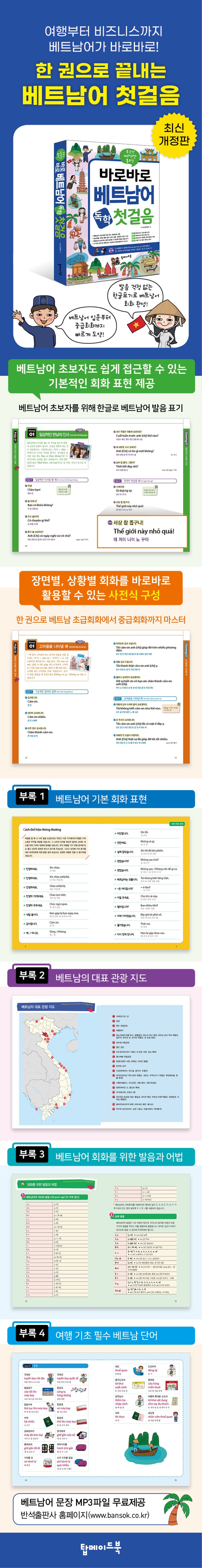 본문일러두기회화를위한발음과어법여행기초필수베트남단어Phan01자연스러운만남의표현Chuong01일상적인만남의인사Bai01일상적인인사를할때Bai02우연히만났을때Bai03안녕을물을때Bai04오랜만에만났을때Bai05안부를묻고답할때Chuong02소개할때의인사Bai01처음만났을때Bai02자신을소개할때Bai03소개시킬때Bai04그밖의소개에관한표현Chuong03헤어질때의인사Bai01밤에헤어질때Bai02기본적인작별인사Bai03방문을마칠때Bai04주인의작별인사Bai05안부를전할때Bai06배웅할때Phan02세련된교제를위한표현Chuong01고마움을나타낼때Bai01기본적인감사의표현Bai02고마움을나타낼때Bai03배려에대한고마움을나타낼때Bai04감사의선물을줄때Bai05감사의선물을받을때Bai06감사표시에응답할때Chuong02사과·사죄를할때Bai01사과·사죄를나타낼때Bai02행위에대한사과·사죄를할때Bai03실수를범했을때Bai04용서를구할때Bai05사과·사죄에대한응답Chuong03축하와환영을할때Bai01축하할때Bai02축복을기원할때Bai03환영할때Chuong04초대를할때Bai01초대할때Bai02초대에응할때Bai03초대에응할수없을때Chuong05방문을할때Bai01손님을맞이할때Bai02음료와식사를대접할때Bai03방문을마칠때Chuong06약속을할때Bai01약속을청할때Bai02스케줄을확인할때Bai03약속제안에응답할때Bai04약속시간과장소를정할때Bai05약속을변경하거나취소할때Chuong07식사를제의할때Bai01식사를제의할때Bai02자신이계산하려고할때Phan03유창한대화를위한표현Chuong01질문을할때Bai01질문을할때Bai02질문에답변할때Chuong02응답을할때Bai01긍정의마음을전할때Bai02부정의마음을전할때Bai03불확실·의심의마음을전할때Chuong03맞장구를칠때Bai01확실하게맞장구를칠때Bai02애매하게맞장구를칠때Bai03긍정의맞장구Bai04부정의맞장구Bai05잠시생각할때Chuong04되물음과이해를나타낼때Bai01되물을때Bai02잘알아듣지못했을때Bai03이해여부를재확인할때Bai04이해를했을때Bai05이해를못했을때Chuong05제안과권유를할때Bai01무언가를제안할때Bai02권유할때Bai03제안·권유에응할때Bai04제안·권유에거절할때Chuong06부탁을할때Bai01부탁을할때Bai02구체적으로부탁할때Bai03부탁을들어줄때Bai04부탁을거절할때Bai05우회적으로거절할때Chuong07대화를시도할때Bai01말을걸때Bai02대화도중에말을걸때Bai03용건을물을때Bai04모르는사람에게말을걸때Chuong08대화의연결과진행Bai01말을재촉할때Bai02간단히말할때Bai03화제를바꿀때Bai04말이막힐때Bai05말을꺼내거나잠시주저할때Bai06적당한말이생각나지않을때Bai07말하면서생각할때Chuong09주의와충고를할때Bai01주의를줄때Bai02충고할때Bai03조언을할때Phan04거리낌없는감정표현Chuong01(감정등을)나타낼때Bai01기쁠때Bai02즐거울때Bai03기쁜소식을들었을때Bai04기쁠때외치는소리Bai05자신이화가날때Bai06상대방이화가났을때Bai07화가난상대를진정시킬때Bai08슬플때Bai09우울할때Bai10슬픔과우울함을위로할때Chuong02놀라움과무서움을나타낼때Bai01자신이놀랐을때Bai02상대방이놀랐을때Bai03믿겨지지않을때Bai04무서울때Bai05진정시킬때Chuong03근심과격려를나타낼때Bai01걱정을물을때Bai02위로할때Bai03격려할때Chuong04불만과불평을할때Bai01귀찮을때Bai02불평을할때Bai03불만을나타낼때Bai04지겹고지루할때Bai05짜증날때Chuong05감탄과칭찬을할때Bai01감탄의기분을나타낼때Bai02능력과성과를칭찬할때Bai03외모를칭찬할때Bai04재주와실력을칭찬할때Bai05그밖의여러가지를칭찬할때Bai06친절과성격에대해칭찬할때Bai07칭찬에대한응답Chuong06비난과책망을할때Bai01비난할때Bai02말싸움을할때Bai03변명을할때Bai04꾸짖을때Bai05화해할때Phan05일상생활의화제표현Chuong01가족에대해서Bai01가족에대해말할때Bai02형제자매와친척에대해말할때Bai03자녀에대해말할때Chuong02직장에대해서Bai01직장에대해말할때Bai02근무에대해말할때Bai03급여에대해말할때Bai04승진에대해말할때Bai05출퇴근에대해말할때Bai06휴가에대해말할때Bai07상사에대해말할때Bai08사직·퇴직에대해말할때Chuong03학교에대해서Bai01출신학교에대해말할때Bai02학년에대해말할때Bai03전공에대해말할때Bai04학교생활에대해말할때Bai05시험과성적에대해말할때Chuong04연애와결혼에대해서Bai01연애타입에대해말할때Bai02데이트에대해말할때Bai03청혼과약혼에대해말할때Bai04결혼에대해말할때Bai05별거와이혼에대해말할때Chuong05여가.취미.오락에대해서Bai01취미에대해물을때Bai02취미에대해대답할때Bai03오락에대해말할때Bai04유흥을즐길때Bai05여행에대해말할때Phan06여행과출장에관한표현Chuong01출국비행기안에서Bai01좌석을찾을때Bai02기내서비스를받을때Bai03기내식사를할때Bai04입국카드를작성할때Bai05기내면세품을구입할때Bai06몸이불편할때Bai07통과·환승할때Chuong02공항에도착해서Bai01입국수속을밟을때Bai02짐을찾을때Bai03세관을통과할때Bai04공항의관광안내소에서Bai05포터(짐꾼)를이용할때Chuong03호텔을이용할때Bai01호텔을예약할때Bai02체크인할때Bai03방을확인할때Bai04체크인트러블Bai05룸서비스Bai06외출과호텔시설을이용할때Bai07호텔이용에관한트러블Bai08체크아웃을준비할때Bai09체크아웃할때Bai10계산을할때Chuong04식당을이용할때Bai01식당을찾을때Bai02식당을예약할때Bai03식당에들어설때Bai04음식을주문받을때Bai05음식을주문할때Bai06먹는법과재료를물