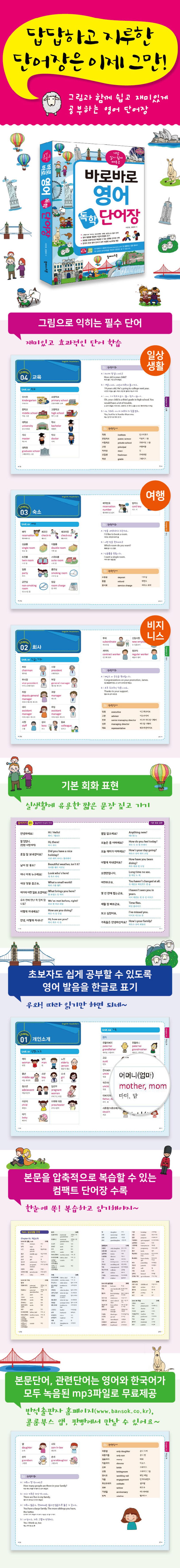 『바로바로 영어 독학 단어장』은 일상생활, 여행, 비즈니스 등 주제별로 단어가 분류되어 있어 자신이 필요한 부분의 단어를 쉽게 찾아 공부할 수 있습니다. 또한 단순히 단어를 나열하기만 한 것이 아니라, 단어 옆에 이미지들을 함께 배치해 단어 공부를 더 효과적이고 즐겁게 할 수 있도록 구성하였고, 단어를 활용해 실생활에서 사용할 수 있는 대화 표현들도 함께 수록하였습니다.