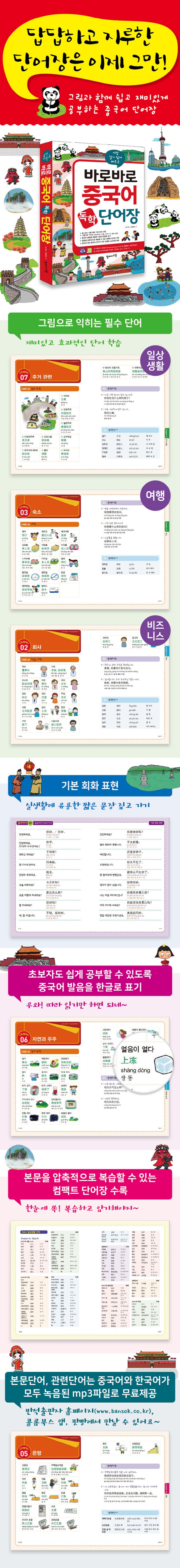 『바로바로 중국어 독학 단어장』은 일상생활, 여행, 비즈니스 등 주제별로 단어가 분류되어 있어 자신이 필요한 부분의 단어를 쉽게 찾아 공부할 수 있습니다.또한 단순히 단어를 나열하기만 한 것이 아니라, 단어 옆에 이미지들을 함께 배치해 단어 공부를 더 효과적이고 즐겁게 할 수 있도록 구성하였습니다. 주요 단어와 관련되는 단어들도 수록했고, 이들 단어를 활용해 실생활에서 사용할 수 있는 대화 표현들이 함께 실려 있습니다. 또한 초보자도 쉽게 따라 읽으며 학습할 수 있도록 중국어 발음을 원음에 가깝게 한글로 표기하였습니다.
