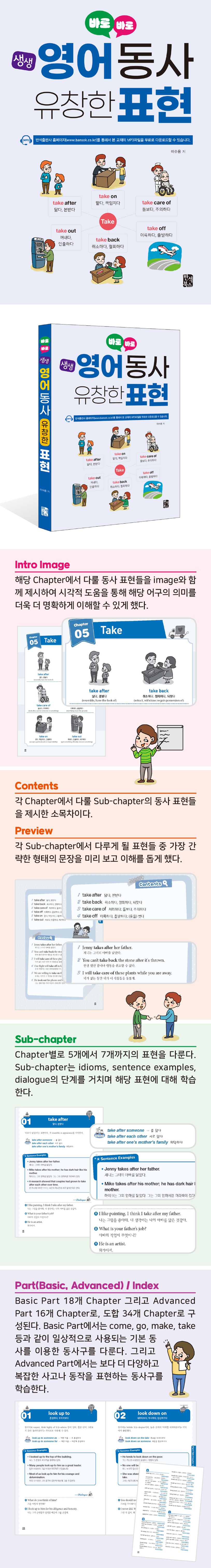 각 Chapter는 5-7개의 동사구로 분류된 Sub-chapter들로 구성된다. 그리고 이렇게 분류된 Sub chapter에서는 Preview, Idioms, Sentence Examples, Dialogue와 같은 단계적 인 과정을 거치며 다양한 예문들을 익힌다. 이 과정을 통해 학습자들은 해당 표현의 정확한 의미뿐만이 아니라, 이 표현들이 실제 문장에서 어떻게 사용되고 또 응용될 수 있는지를 명확하게 파악할 수 있다. 예문으로 제시되는 문장들은 모두 실생활에서 사용되는 생생한 살아있는 표현들이다.