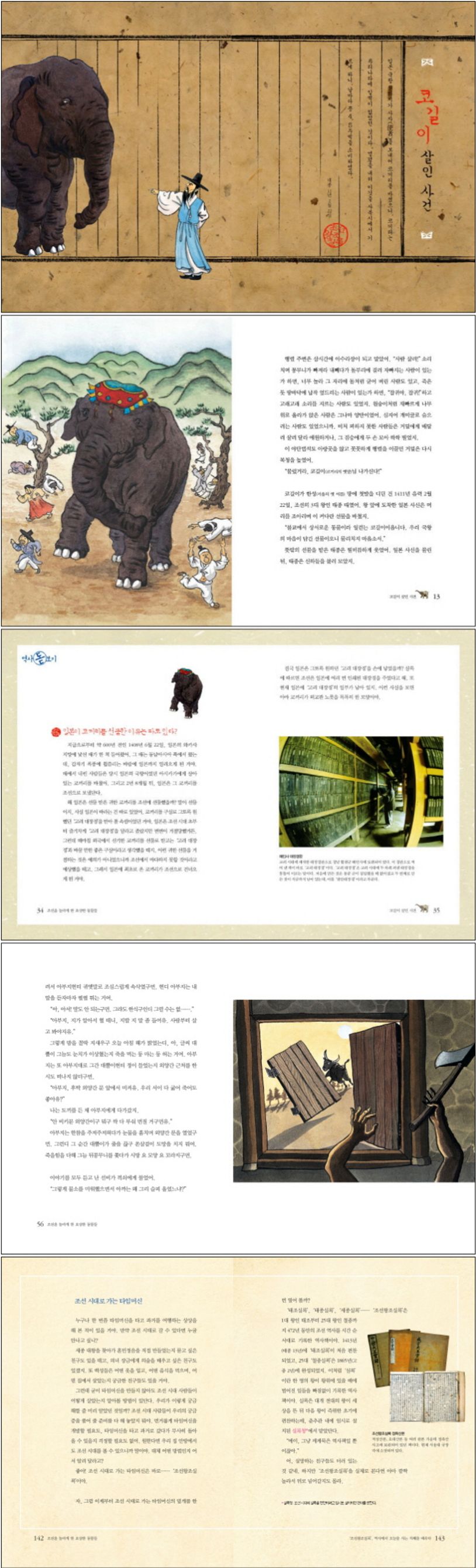 이 책은 이렇게 코끼리가 우리나라에 처음 등장한 이야기부터 조선 땅에 정착시켜 보려 했으나 실패한 양 이야기, 성종이 원숭이를 아끼는 마음에 원숭이에게 옷을 입히려 했다가 신하들의 반대로 그만둔 이야기, 중국에서 물소를 들여와 그 뿔로 활을 만든 이야기, 숙종 때 궁궐에 들어왔다가 쫓겨난 낙타 이야기 등 5편의 흥미진진한 역사 이야기가 가득 들어있답니다.