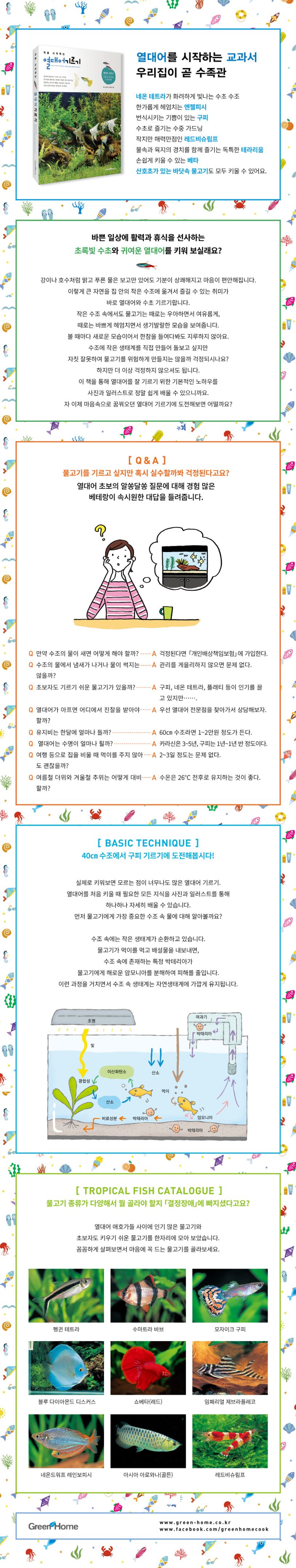 출판사서평★네온테트라가화려하게빛나는수초수조한가롭게헤엄치는엔젤피시번식시키는기쁨이있는구피수초로즐기는수중가드닝작지만매력만점인레드비슈림프물속과육지의경치를함께즐기는독특한테라리움손쉽게키울수있는베타산호초가있는바닷속물고기까지우리집이곧수족관이다★바쁜일상에활력과휴식을선사하는초록빛수초와귀여운열대어기르기를시작해보실래요?강이나호수의맑고푸른물은보고만있어도마음이편안해지고안정감이느껴진다.이렇게큰자연을집안의작은수조에재현하...★네온테트라가화려하게빛나는수초수조한가롭게헤엄치는엔젤피시번식시키는기쁨이있는구피수초로즐기는수중가드닝작지만매력만점인레드비슈림프물속과육지의경치를함께즐기는독특한테라리움손쉽게키울수있는베타산호초가있는바닷속물고기까지우리집이곧수족관이다★바쁜일상에활력과휴식을선사하는초록빛수초와귀여운열대어기르기를시작해보실래요?강이나호수의맑고푸른물은보고만있어도마음이편안해지고안정감이느껴진다.이렇게큰자연을집안의작은수조에재현하여즐길수있는취미가바로열대어와수초기르기다.주인의말과표정에도반응하는강아지나고양이처럼물고기도키우는재미가있을까궁금해하는사람도있을것이다.물론답은「Yes」이다.수조라는제한된공간이지만,그안에서때로는물살에흔들리는수초처럼여유롭게,때로는여기저기바쁘게헤엄치며매번다른모습을보여주는물고기는한없이바라보고싶을만큼귀엽고사랑스럽다.또한주인에게익숙해지면물고기는먹이를준다고생각하고주인에게가까이다가오게되는데,이렇게작은물고기가보여주는친밀한행동을보면서예상하지못했던기쁨까지느끼게된다.수조안에작은생물이살아숨쉬는것만으로이렇게나생활이달라질수있고,하루하루가즐거워질수있다.또한수초를메인으로하여아름답게가꾼수중가드닝은그자체로훌륭한인테리어가되므로일석이조의효과가있다.열대어를잘기르기위한기본적인노하우를사진과일러스트로가르쳐주는열대어교과서수조만갖추거나간단한도구만있어도얼마든지물고기를키울수있다.하지만수조와주변도구의사용법을익히고물고기와수초,수질에대해배우면물고기를더욱잘키울수있다.이책은열대어를처음기르는사람이꼭알아야하는기본지식을사진과일러스트로쉽게가르쳐준다.또한물고기를기르고싶지만혹시실수할까봐주저하는사람들에게도열대어전문점의베테랑이Q&A를통해완벽한대답을들려준다.마음속으로꿈꿔오던물고기를선택하는것도중요하지만,살아있는생명체인물고기가쾌적하게살수있게물속환경을만들어주는것이우선이다.즉,물고기를구입하기전에먼저물고기가살아갈수조속환경부터최대한자연생태계에가깝게맞추어놓아야한다.이책을보면서믿을수있는열대어샵에서꼭필요한용품들을갖추고,물고기를풀어놓아도쇼크사하지않고마음껏헤엄칠수있는수조를만드는법을배울수있을것이다.경험이쌓이고자신감이커질수록키우고싶은물고기가다양해진다.어떤물고기를기를까즐거운고민을하게되는순간,이책에서소개하는80여종의화려한열대어도감을하나하나읽으면서마음에쏙드는물고기를선택할수있을것이다.