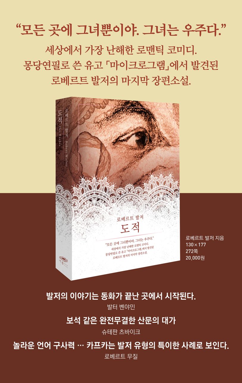 『도적』은 로베르트 발저가 1925년에 베른에서 집필한 소설로, 작가 사후인 1972년에 최초로 출간되었다. 이 소설의 초고는 발저가 몽당연필로 쓴 마이크로그램 원고 중 하나에 속한다. 이 원고는 독일어 필기체를 축소한 형태의 미세한 필체로 쓰여졌으며, 그 결과 『도적』의 전체 초고는 단 24쪽의 원고지에 모두 들어갔다. 이처럼 읽기 어려운 발저의 미세한 필체는 흔히 ‘암호문’이라고 불리곤 했다. 문학 연구자들 사이에서는 이 소설이 애초에 발저에 의해 출판을 의도한 작품이 아니었다는 견해가 지배적이다. 실제로 이 원고에는 제목조차 붙어 있지 않았다.