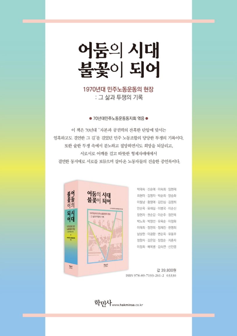 이 책은 1970년대 ‘어둠의 시대’에 ‘자본과 공권력의 잔혹한 탄압에 맞서 결연한 투쟁의 길’을 걸었던 이 땅의 민주 노동조합들의 기록이다. 다른 한편, 이 책은 숱한 투쟁 속에서 분노하고 절망하면서도 희망을 되살리고자 서로서로 어깨를 건 따뜻한 형제자매의 정으로, 결연한 동지애로 서로를 보듬으며 살아온 노동자들의 진솔한 증언이기도 하다.