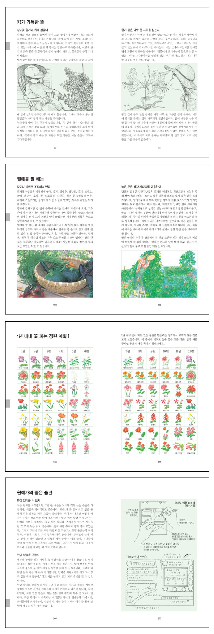 이 책은 원예의 과정을 8단계로 나누어 소개하고 있다. 정원을 가꿀 때 알아야할 사항을 단계별로 소개하고, 직접 키울 수 있는 원예 식물과 채소, 과일 정보도 함께 다루었다. 선인장이나 허브에서부터 딸기나 토마토까지 각 식물의 원산지와 특징, 키우는 방법 및 활용법을 알려준다.