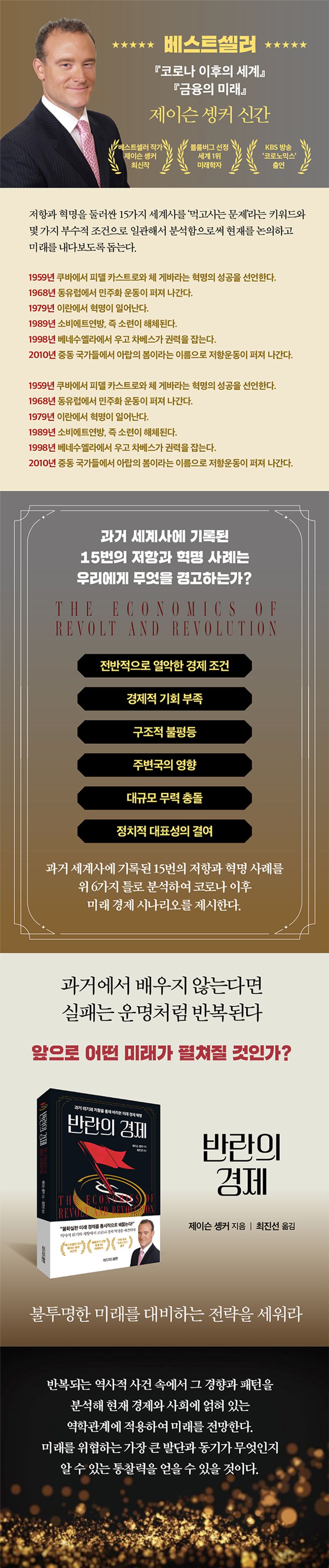 세계 최고 미래학자이자 퓨처리스트 인스티튜트 회장 제이슨 솅커는 과거에 일어났던 저항과 혁명이 코로나19 팬데믹과 불황 이후 미래에 어떤 암시를 주는지 이해하고, 더 나아가 역사적 사건에서 현 경제 상황을 극복하고 미래를 대비하는 각자의 전략을 짤 수 있도록 이 책을 썼다.