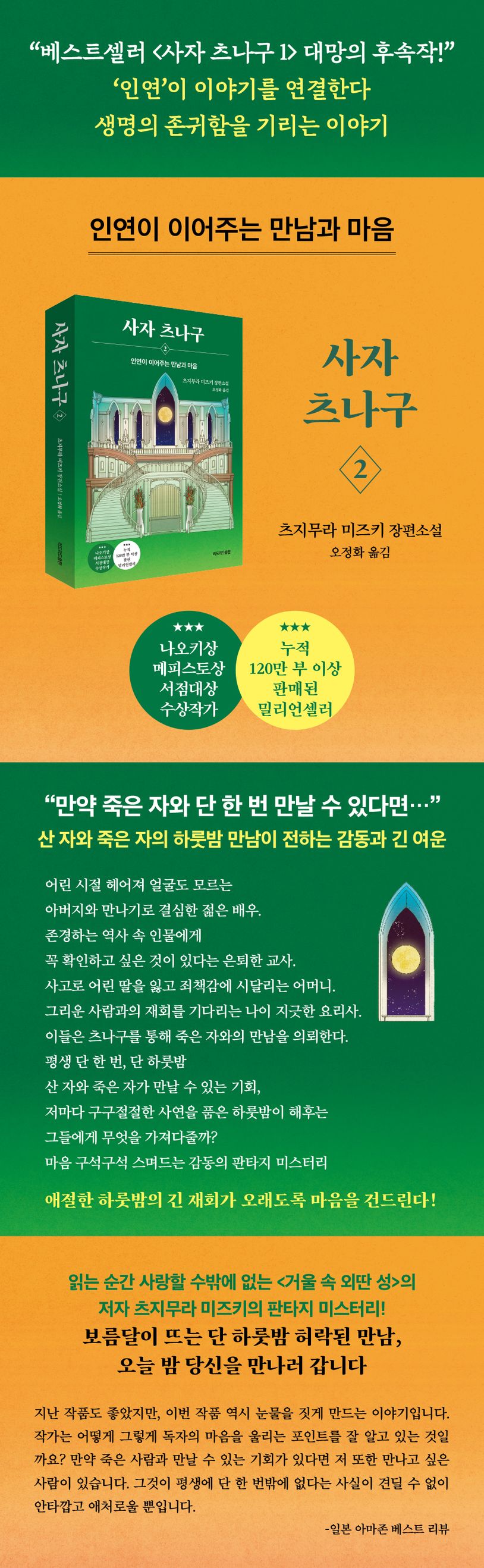 작가 츠니무라 미즈키는 새삼스럽게 소개할 필요도 없는 인기 작가지만, 그의 다양한 작품 중에서도 2010년에 출간된 《사자 츠나구 1》은 유난히 빛을 발하는 작품이다. 오랜 세월 츠나구로 지낸 다정한 할머니로부터 그 역할을 물려받은 고등학생 시부야 아유미. 그 소년의 눈을 통해 죽은 자와의 재회를 바라는 사람들의 마음과 하룻밤의 만남으로 발생한 파문과 같은 드라마를 그려낸 아름다운 연작 단편집이다.
