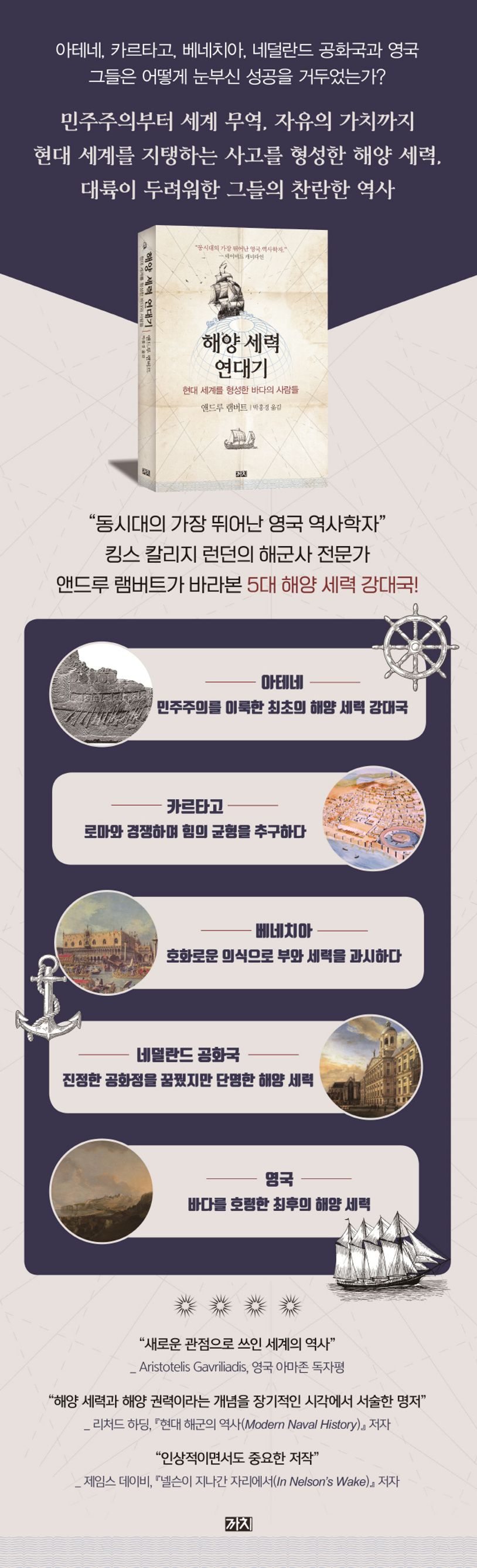 아테네와 카르타고, 베네치아와 네덜란드 공화국 그리고 영국. 광대한 영토나 수많은 인구 없이도 풍요로움과 강성함으로 역사에 이름을 남긴 이들의 공통점은 무엇일까? 영국의 해군사 전문가이자 동시대의 가장 뛰어난 역사학자로 평가받는 앤드루 램버트는 바다를 기반으로 자신들의 정체성을 구축한 이들을 해양 세력으로 정의하면서, 이들이 어떻게 현대 사회의 토대를 형성했는지를 톺아본다. 흔히 바다 주위에서 대륙 진출을 꿈꾸는 세력을 해양 세력이라고 부르는 것과 달리, 이들은 대륙을 향한 야욕을 가지는 대신 패권 국가를 경계하며 국제 사회의 균형을 이루고자 했고, 무역 활동을 위협받지 않는 한 스스로 전쟁을 일으키지 않았다. 또한 거친 바다에서 살아남기 위해서 국민을 포용하는 공화정과 민주정을 발전시켰고, 경제적으로는 무역을 중시하는 열린 태도를 보임으로써 현대 정치, 경제의 기반을 닦았다. 고대에서 현대를 가로질러 등장해온 5대 해양 세력은 반도 국가로서 무역을 중시하는 한국의 독자들에게 세계사를 새롭게 이해하는 기회를 제공할 것이다.