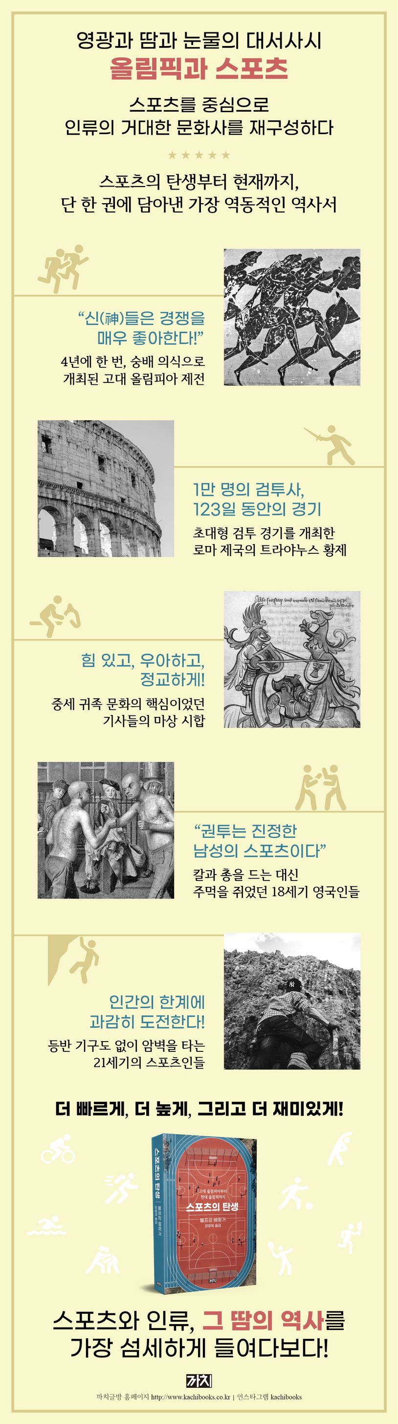 스포츠의 역사가 곧 인류의 역사이다! 인류가 가장 단순한 운동인 달리기를 시작한 이래로 종교, 정치, 사회, 예술 등 인류의 모든 문화는 스포츠와 함께 발달해왔다. 이 책은 인간의 움직이고자 하는 욕망에 따라 꾸준히 변화, 발전해온 스포츠의 역사적 궤적을 따라가면서, 스포츠를 중심으로 인류의 거대한 문화사를 재구성한다. 전 세계인이 스포츠에 열광하는 뜨거운 축제 올림픽을 코앞에 앞둔 현재, 『스포츠의 탄생』은 스포츠에 관한 인문학적 ‘트레이닝’을 위한 단 한 권의 책이 될 것이다. 문화사 전문가인 저자 볼프랑 베링거는 나체로 경기했던 고대 올림피아 제전부터 중세와 르네상스 시대에 귀족들이 즐겼던 섬세한 운동들, 그리고 빠르게 진화하고 있는 현대 스포츠 종목에 이르기까지 거의 모든 스포츠의 역사를 연대기순으로 살펴보면서 스포츠와 관련된 인류의 눈부신 장면들을 흥미롭게 펼쳐낸다. 시공간을 넘나들며 역동적인 운동의 장(場)에 뛰어드는 이 책과 함께, 독자는 스포츠에 관한 놀라운 통찰을 얻을 수 있을 것이다.