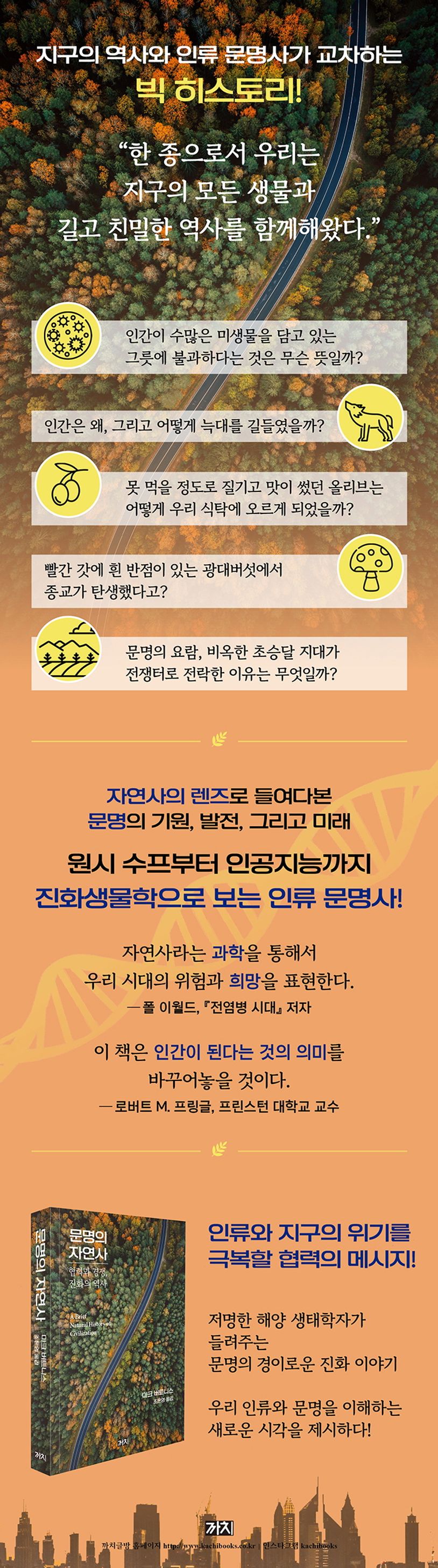 브라운 대학교 명예교수이자 평생 해양 생태계 연구에 몸담은 이 책의 저자 마크 버트니스는 인류 문명을 인간이라는 종(種)이 자연환경에 대응하는 과정이라고 해석하며, 자연사(自然史)라는 과학의 렌즈를 통해서 인류의 역사를 살펴보려는 새로운 시도를 한다. 농업에서부터 의학과 정치 그리고 종교에 이르기까지, 문명과 문명의 산물들이 특정한 환경에 적응하며 발전해온 과정을 흥미로운 사례 및 연구 결과들과 함께 그려낸다.