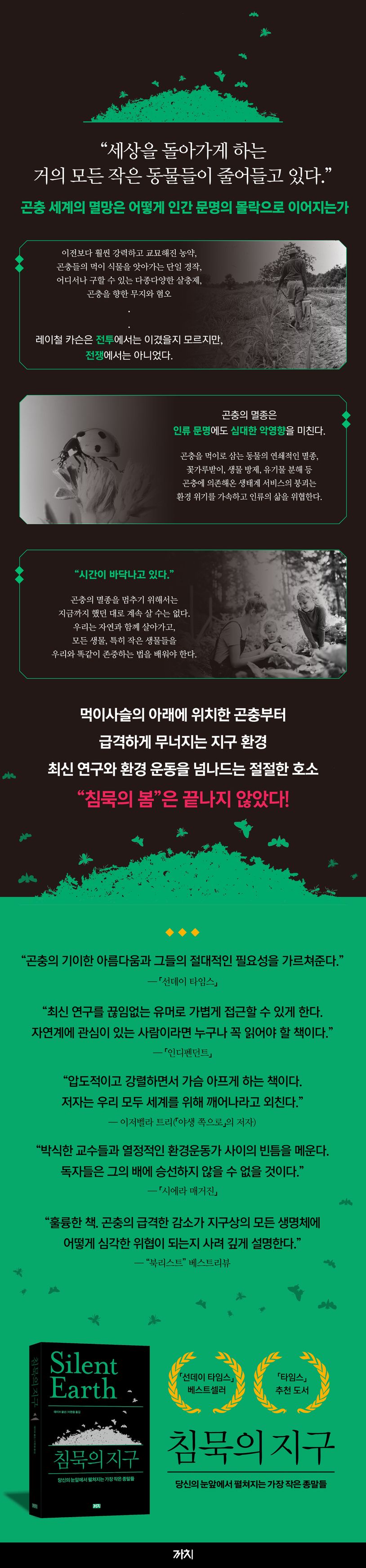 레이철 카슨의 『침묵의 봄』 이후 환경 위기는 이제 익숙한 화두가 되었지만, 멸종과 관련된 논의는 눈에 띄는 동물들 위주로 이루어져왔다. 그러나 야생생물의 멸종은 우리의 곁에서도 매일 일어나고 있다. 세계 어디에나 존재하는 곤충들이 우리의 발아래에서, 눈앞에서 조용히 사라지고 있기 때문이다. 『침묵의 지구』의 저자 데이브 굴슨은 우리에게 외면받은 채 급격하게 사라져가는 곤충들의 멸종에 주목한다.