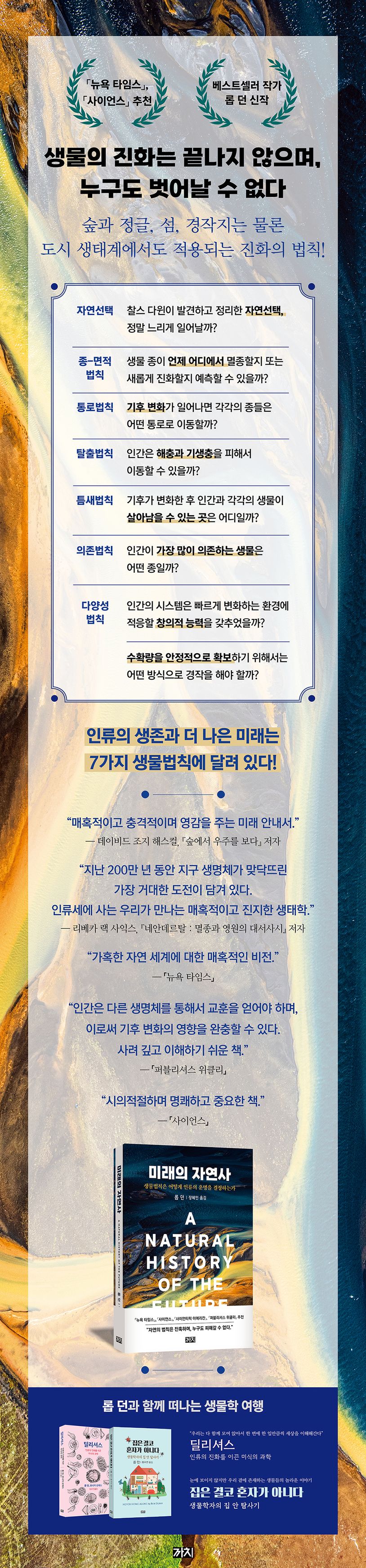 과학기술이 발달한 이래 인류는 자연을 끊임없이 통제하고 마음대로 가져다 쓸 수 있는 자원으로 재단해왔다. 그러나 인간은 지구 생물의 중심이 아니며, 인간에게 맞춰온 환경은 오히려 인간에게 부적합한 방향으로 바뀌어가고 있다. 그렇다면 인류가 맞닥뜨릴 미래는 어떤 모습이며, 인류가 더 오래 생존하기 위해서는 어떻게 행동해야 할까? 생물학자이자 베스트셀러 작가인 롭 던은 지구생물에 적용되는 생물법칙이 있으며, 인간 역시 이 법칙에서 자유롭지 않다고 말한다. 이에 따라 그는 과거에 초점을 맞추어 자연사를 서술한 기존의 논의와 달리 생물법칙을 토대로 인류가 직면할 미래를 그려 보인다. 또한 오늘날 인류의 대부분이 살아가는 환경인 도시에 생물법칙을 적용하여 우리 주변에서 진화가 어떻게 일어나는지 설명한다. 7개의 생물법칙을 기반으로 인류가 처한 상황을 진단하고 미래를 예측하는 이 책을 통해서 독자는 미래 환경과 인류를 위해 움직일 방향을 가늠할 수 있을 것이다.