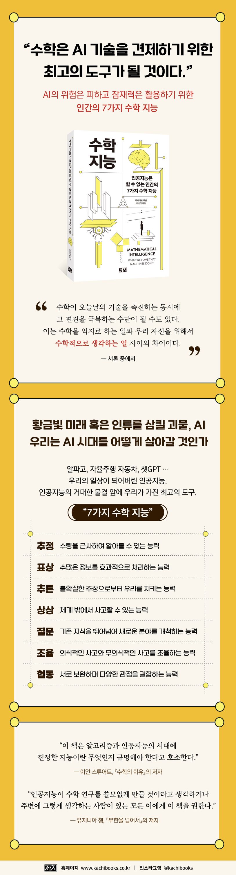 인공지능(AI)은 이미 우리의 일상이 되고 있다. 2016년 알파고와 바둑 기사 이세돌의 세기의 대결은 결국 알파고의 승리로 끝이 났고, 이는 AI에 대한 우리의 인식에 엄청난 변화를 가져온 분기점이 되었다. 또한 오픈AI가 발표한 ChatGPT로 인해서 AI에 대한 관심은 일상의 저변으로까지 확대되고 있다. AI가 가져올 황금빛 미래를 기대에 찬 시선으로 바라보는 관점과 인간의 지능을 능가하는 초지능의 출현으로 인류가 위험을 맞을 것이라는 암울한 관점이 공존하는 가운데, AI의 발전은 점점 가속되고 있다. AI의 눈부신 발전의 토대에는 수학이 있다. 그리고 인간에게는 AI가 결코 가질 수 없는 수학 지능이 있다. 순수 수학을 전공하고 이후에는 10년 넘게 수학 교육에 힘써온 저자 주나이드 무빈은 인간에게는 AI의 시대를 현명하게 살아가고 AI 기술을 견제할 수 있는 최고의 도구인 수학 지능이 있다고 말한다. 저자가 꼽은 일곱 가지 수학 지능은 바로, 추정, 표상, 추론, 상상, 질문, 조율, 협동이다. 우리의 가장 자연스러운 사고방식에 녹아 있는 이 원리들을 파악하고 활용한다면, AI에 대한 새로운 이해를 발견할 수 있을 것이다.