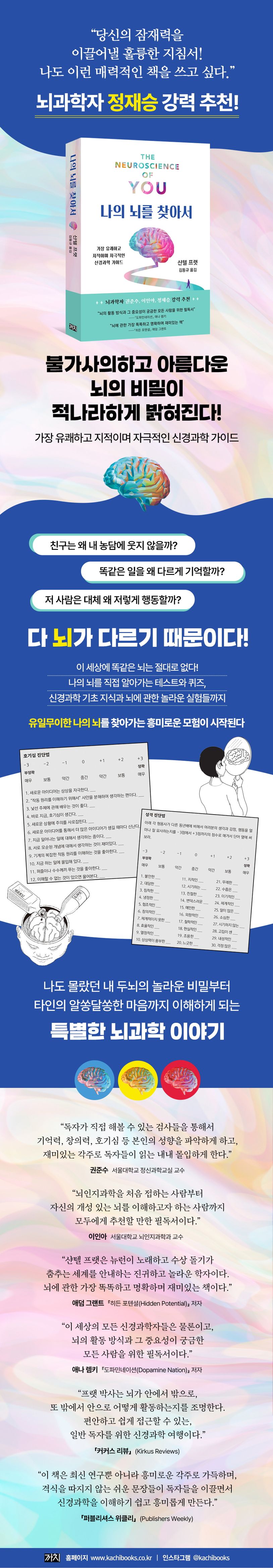 이 책에는 독자가 직접 해보면서 자기 뇌의 특별함을 발견할 수 있는 흥미롭고 간단한 검사들이 실려 있으며, 가볍고 유머러스한 문장들이 초심자에게는 어려울 수도 있는 신경과학의 이론들을 쉽게 이해하도록 돕는다. 이 책을 읽으며 내가 나일 수밖에 없는 이유를 탐구하는 신경과학적 지식들을 차근차근 쌓다 보면, 다른 사람들도 더욱더 깊이 이해하게 되는 놀라운 경험도 할 수 있다.