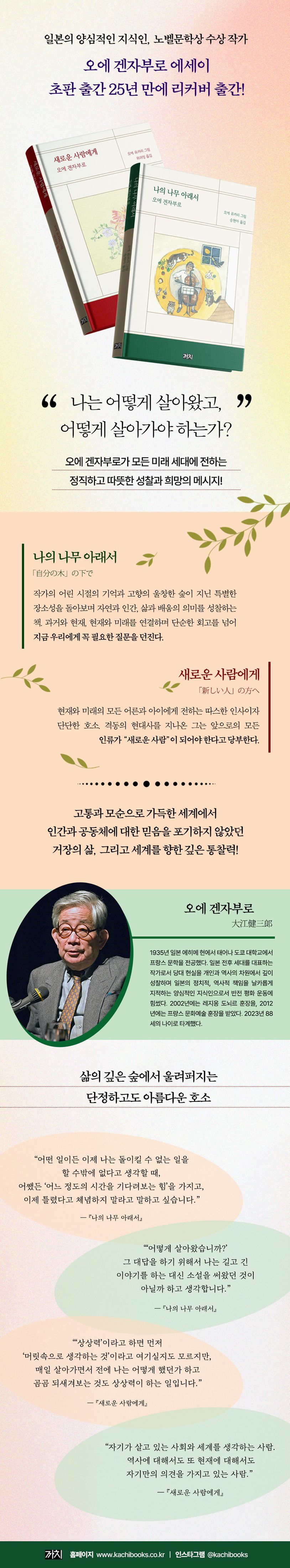 문학과 삶에 대한 오에 겐자부로의 원숙한 통찰이 담긴 에세이 『나의 나무 아래서』와 『새로운 사람에게』가 새로운 옷을 입고 다시 독자를 찾아왔다. 오에 겐자부로의 아내인 오에 유카리의 온화한 수채화가 잔잔하게 어우러진 이 두 편의 에세이는 일본을 대표하는 양심적인 지식인 오에 겐자부로가 삶의 후반부에 쓴 자전적인 글로, 다음 세대에게 흔들림 없는 희망과 진심 어린 당부의 메시지를 전한다. 한평생 “삶이란 무엇인가?”, “어떻게 살아야 하는가?”를 질문해온 세계적인 문호답게, 그는 정해진 해답이 아닌 정직한 삶의 체험이 깃든 진솔한 이야기를 들려준다. 어린아이의 무구하고 예리한 질문에 답하는 그의 글에서는 20세기의 아픔을 지나온 개인과 공동체의 체험, 장애를 가지고 태어난 아들 히카리와 함께한 삶, 배움과 언어의 중요성, 모든 생명의 존엄과 평화에 대한 사유가 잔잔하고 깊이 있게 펼쳐진다. 소박하지만 통찰력 있는 거장의 시선을 따라가다 보면, 자연히 인간의 삶의 본질을 반추하게 된다.