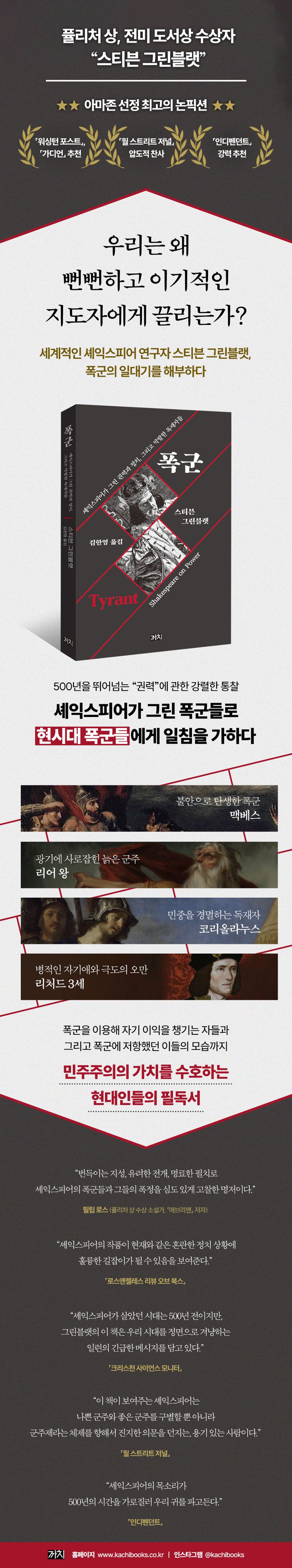 그린블랫은대문호의시대와작품의안팎을충실히읽어내며지금셰익스피어의희곡을읽어야하는이유를제시한다.그리고셰익스피어가과거를그리며당대를비판했듯이,셰익스피어를통해서현시대의폭군들에게일침을가한다.셰익스피어가그린,폭군이지배하는어지러운사회를보며우리는자연스레오늘날의세계곳곳을떠올리게된다.셰익스피어를사랑하고,과거가현재를어떻게비추는지관심이있으며,무엇보다도민주주의를지키는일에진심이라면,그린블랫의이책을지나치지못할것이다.