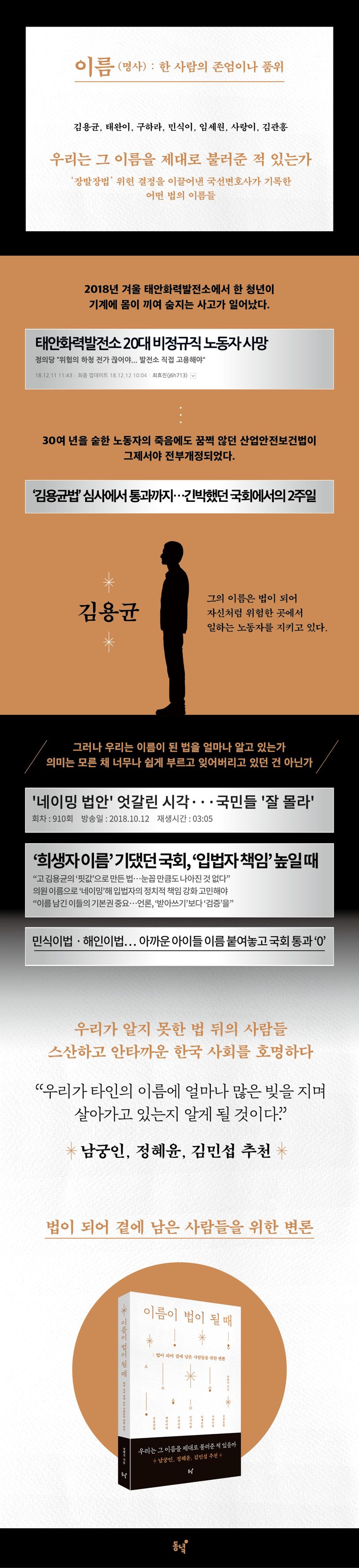 고유명사로 태어나 비극적인 일로 죽거나 희생된 뒤 모두가 기억하는 보통명사가 된 사람들이 있다. 2018년 겨울 한국발전기술의 하청업체에서 일하던 노동자가 기계에 몸이 끼여 숨지는 사고가 일어났다. 산재가 분명했지만 법적으로는 원청을 처벌할 근거가 없었다. 하청 노동자가 죽거나 다치면 원청이 책임을 지라는 것, 그 당연한 말을 법에 새기기 위해 어머니는 아들 김용균의 이름을 기꺼이 세상에 내어줬다. 어떤 이름은 그처럼 위험에서 노동자를 지키는 법이 되기도, 장기 미제 살인 사건의 피해자를 구하는 법(태완이법)이 되기도, 어린이 같은 약자를 보호하는 법(민식이법)이 되기도 한다. 김용균, 태완이, 구하라, 민식이, 임세원, 사랑이, 김관홍……. 이 책은 한국 사회를 변화시키거나 우리의 태도를 바꾼 법이 된 사람들 일곱 명의 이야기를 담았다.