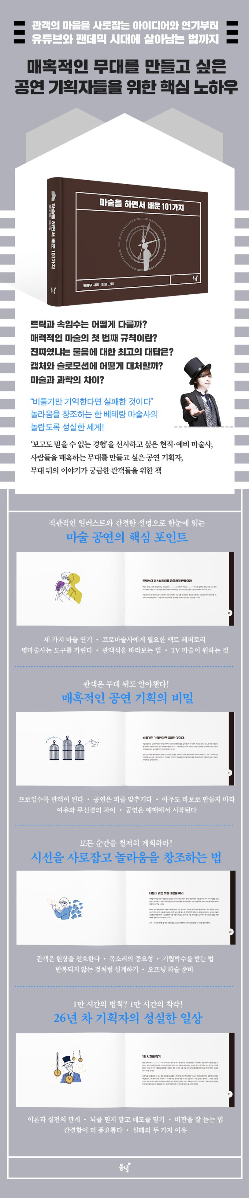 마술이 대중문화의 한 분야로 자리 잡은 이후 개별 마술의 메커니즘과 관련된 호기심을 충족해주는 책은 여럿 나와 있지만, 화려한 무대 뒤 직업인으로서 마술사의 일상, 일로서의 마술에 관한 이야기는 거의 알려지지 않았다. ‘생계형 마법사’를 자처하며 매체와 장르를 넘나들며 현직 마술사로 활동하는 저자는 이 책에서 지금껏 이야기되지 않았던 무대의 뒷이야기를 간결한 설명과 그림으로 들려준다. 이를 통해 장르와 트릭, 연기와 화술 등 베테랑 마술사가 알려주는 공연의 기본기부터, 끝없이 아이디어를 고치며 늘 공부하는 한 기획자의 성실한 일상까지 엿볼 수 있다.