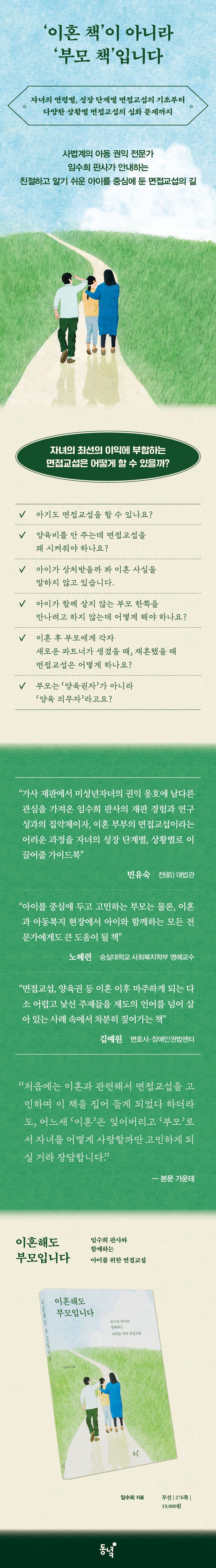 하지만 자녀를 가장 소중하게 여긴다고 하면서도, 막상 이 자녀가 보장받아야 할 권리는 등한시하는 경우가 여전히 비일비재하다. 여기서 자녀가 보장받아야 할 권리란, 이혼을 비롯해 여러 사정으로 아동이 부모와 분리되더라도 부와 모 모두에게 한결같은 애정과 돌봄을 받으며 그 관계를 지속할 수 있어야 한다는 것이다. 이 권리를 실현하는 기본적 전제인 동시에 실천이 바로 면접교섭이라는 점은 이 책의 가장 중요한 전제다.