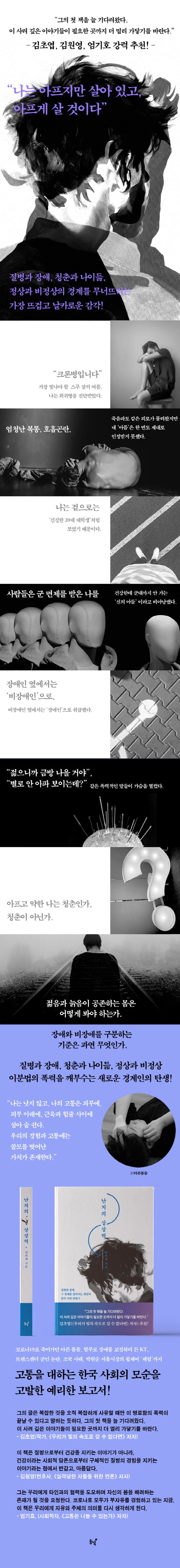 정체성을의심받기도했다.저자가오래일했던장애인권동아리의회장으로출마한날,저자는‘장애인’이아니라는이유로동료들의거센반대에부딪혀야했다.사람들은저자를장애인옆에서는‘비장애인’으로,비장애인옆에서는‘장애인’으로변덕스럽게취급했다.한노인으로부터‘젊으니금방나을것’이라는무례한훈수를듣거나상대의오해를사지않기위해자신이사실은희귀병을앓고있다는걸설득해야했다.청춘이지만청춘이아니고,장애도비장애도아닌몸,멀쩡한면역수치를억지로낮춰야하는비정상의몸.