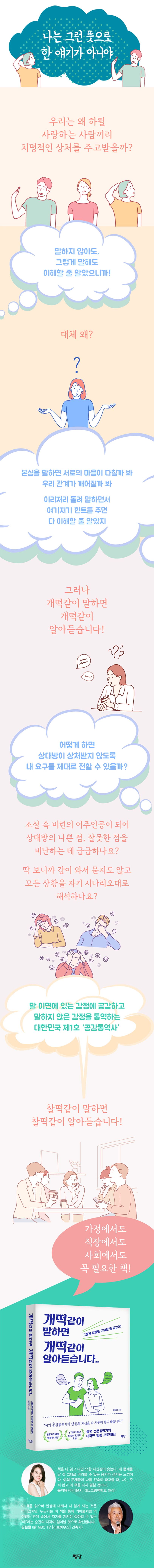왜 그럴까? 왜 하필 사랑하는 사람끼리, 가족끼리 치명적인 상처를 주고받을까? 우리는 어릴 때부터 싸움은 무조건 나쁜 것이고 친구끼리는 무조건 사이좋게 지내라고만 배웠다. 그래서 가장 친밀해야 할 커플, 가족 간에는 가짜 친밀함만 가득하고, 잠재된 갈등이 폭발해 싸움이라도 벌어지면 십중팔구 파국으로 치닫게 된다. 그게 두려워서 고통 속에 참고 사는 사람들이 너무나 많다. 이 책은 관계에서 비롯되는 마음의 문제들에 초점을 맞춰 모든 문제를 수술대에 올려놓고는 어설픈 위로보다는 냉정한 조언으로 해법에 접근한다. KBS, EBS, YTN 등 다양한 방송사에서 심리상담가로 활동하기도 한 저자는 방송에서 온갖 고민을 털어놓은 청취자들에게 사이다 같이 통쾌하고도 현실적인 조언들을 제시했는데, 이 책은 그동안 방송과 상담실에서 접했던 사례들을 토대로 집필되었다. 말 이면에 있는 감정에 공감하고 말하지 않은 감정을 통역하는 일을 한다는 뜻으로 저자는 자신을 ‘공감통역사’라 소개한다. 자신의 감정을 이야기하는 데 서툴고 상대방의 감정을 헤아리는 법을 배우지 못한 수많은 보통 사람들을 위해 이 책은 속 시원한 해법이 될 것이다. 남녀노소 누구든지 이 책을 통해 자신의 진짜 모습, 내면의 심리를 직시하게 되면서 더 나은 관계를 만들어나가는 시발점이 될 것이다.