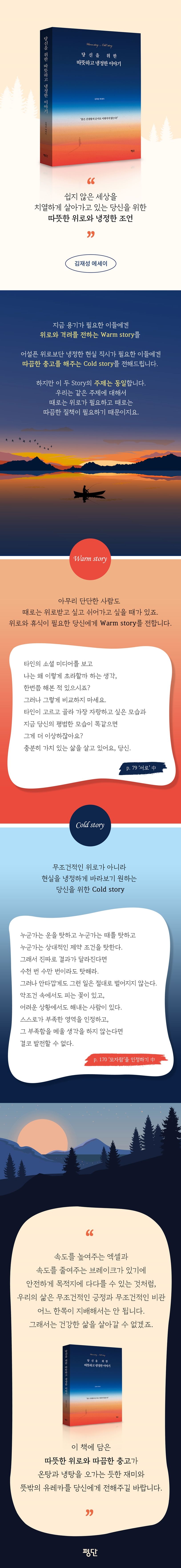 책은 성장, 인간관계, 사랑, 통찰이라는 우리네 삶을 이루는 4가지 큰 주제를 다룬다. 성장과 성취에도, 인간관계에도, 그 안에서 배우는 통찰과 사랑까지도 현실을 냉정하게 바라보고 스스로를 다독여줄 필요가 있음을 알려준다. 때로는 치열하게, 때로는 성장통을 겪으며 조금씩 삶을 만들어가는 게 인생이므로. 1부 Warm story와 2부 Cold story는 온탕과 냉탕을 오가듯 읽는 재미를 더한다.