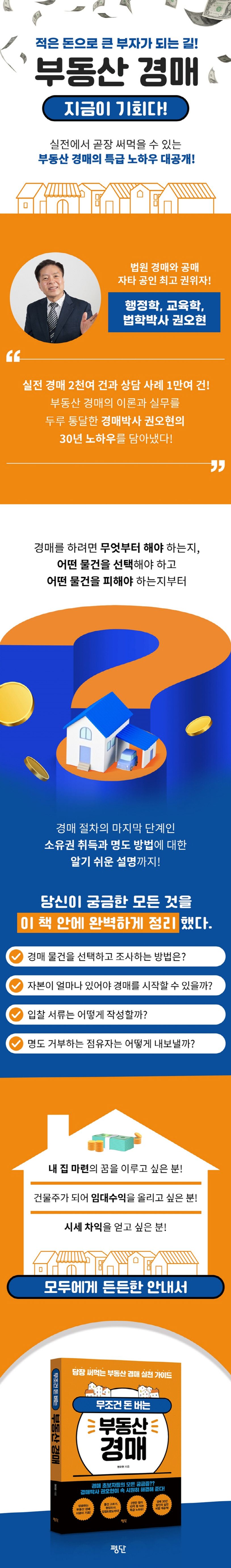 이 책은 30여 년간 부동산 경매 관련 강의를 하면서 수많은 경매 상담으로 경매에 참여하려는 투자자들에게 길잡이 역할을 해온 ‘경매박사’ 권오현의 경매 노하우로 가득하다. 경매 초보자도 경매에 쉽게 접근하도록 법원경매는 어떻게 진행되는지부터 법원경매에 입찰하는 방법, 관련 매각대금의 납부 방법과 매각에 따른 소유권이전등기, 경매와 관련한 등기, 채무자·임차인을 대상으로 한 부동산인도명령과 각종 사례를 담았다. 또한 경매에서 중요한 부동산 권리분석 방법을 가압류, 가등기, 대위변제, 법정지상권 등 사례별로 소개하고 대금 지급 방법과 배당 절차, 배당 순위를 이해하기 쉽게 정리했다.