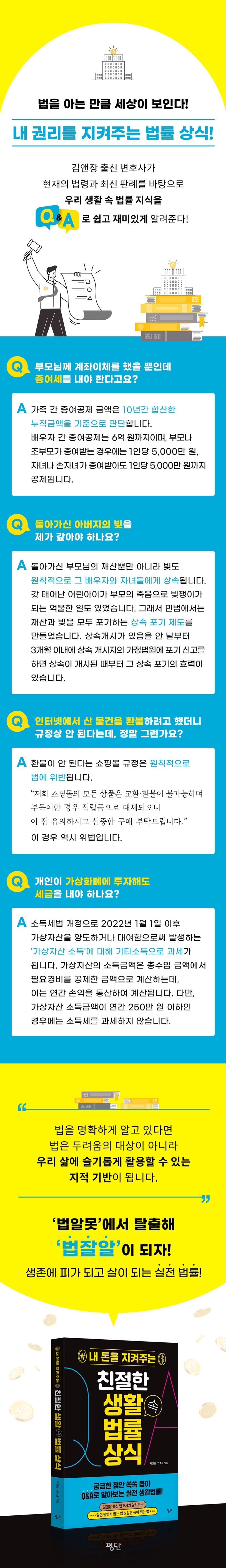모르는 게 약일 수도 있지만 사실 모르면 손해 보는 일이 더 많다. 우리가 눈을 떠서 밥을 먹고 사람들을 만나고 잠을 자기까지 한순간도 그 보호 아래에 있지 않은 적이 없는 법이 바로 그렇다. 하지만 법이 가까이 있는 듯해도 막상 내가 궁금한 법, 내게 필요한 법은 쉽게 손에 잡히지 않는다. 인터넷 검색으로는 마땅한 설명을 찾기가 어렵고 막상 대답을 찾아도 무슨 말인지 잘 모르겠다. 그렇다고 바로 전문가에게 상담받기는 망설여진다. 게다가 사회적 합의체인 법은 사회가 변화하면 따라서 계속 바뀌니 더 어렵게 느껴진다. 그런데 지금은 법을 모르면 손해 보는 세상이다. 자본주의 사회에서 돈을 잘 다루는 것은 곧 법을 잘 다루는 것과 비슷하기에 법을 안다는 것은 큰돈을 가지는 것과 같다.